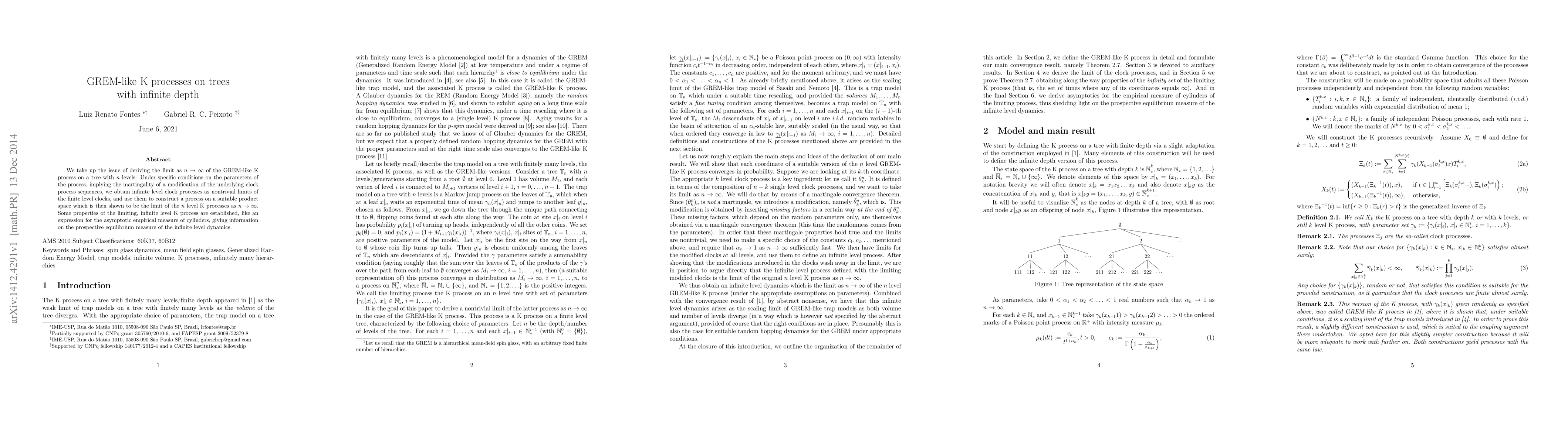 We take up the issue of deriving the limit as $n\to\infty$ of the GREM-like K process on a tree with $n$ levels. Under specific conditions on the parameters of the process, implying the martingality of a modification of the underlying clock process sequences, we obtain infinite level clock processes as nontrivial limits of the finite level clocks, and use them to construct a process on a suitable product space which is then shown to be the limit of the $n$ level K processes as $n\to\infty$. Some properties of the limiting, infinite level K process are established, like an expression for the asymptotic empirical measure of cylinders, giving information on the prospective equilibrium measure of the infinite level dynamics.