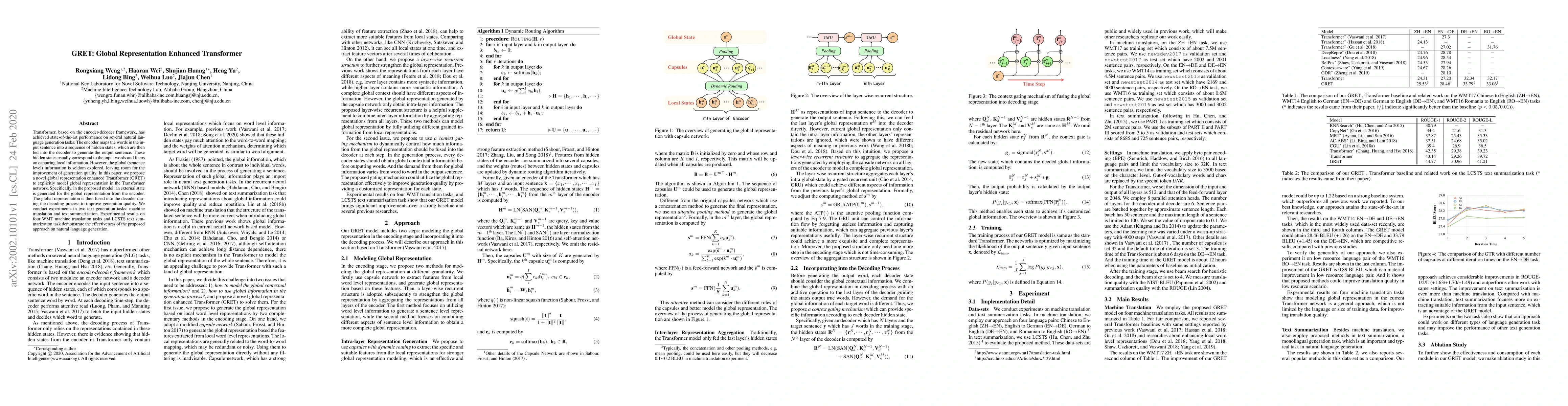 Transformer, based on the encoder-decoder framework, has achieved state-of-the-art performance on several natural language generation tasks. The encoder maps the words in the input sentence into a sequence of hidden states, which are then fed into the decoder to generate the output sentence. These hidden states usually correspond to the input words and focus on capturing local information. However, the global (sentence level) information is seldom explored, leaving room for the improvement of generation quality. In this paper, we propose a novel global representation enhanced Transformer (GRET) to explicitly model global representation in the Transformer network. Specifically, in the proposed model, an external state is generated for the global representation from the encoder. The global representation is then fused into the decoder during the decoding process to improve generation quality. We conduct experiments in two text generation tasks: machine translation and text summarization. Experimental results on four WMT machine translation tasks and LCSTS text summarization task demonstrate the effectiveness of the proposed approach on natural language generation.