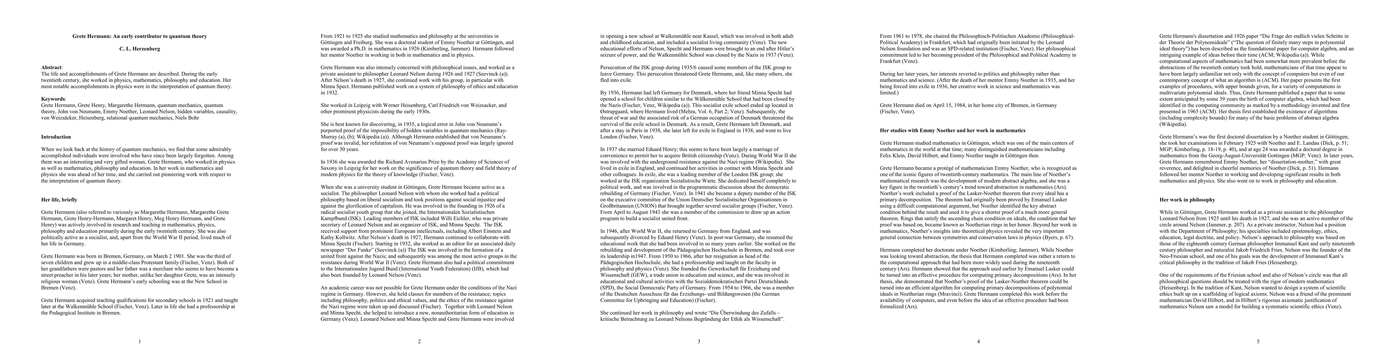 The life and accomplishments of Grete Hermann are described. During the early twentieth century, she worked in physics, mathematics, philosophy and education. Her most notable accomplishments in physics were in the interpretation of quantum theory.