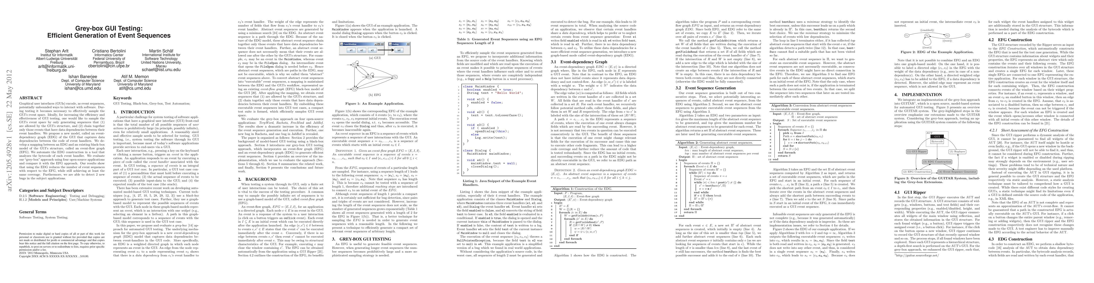 This paper proposes algorithms for efficient grey-box GUI testing by generating event sequences that respect the GUI's structure and data dependencies, using an event-dependency graph (EDG). The EDG approach reduces test cases while maintaining coverage, and detected two new bugs in tested applications.