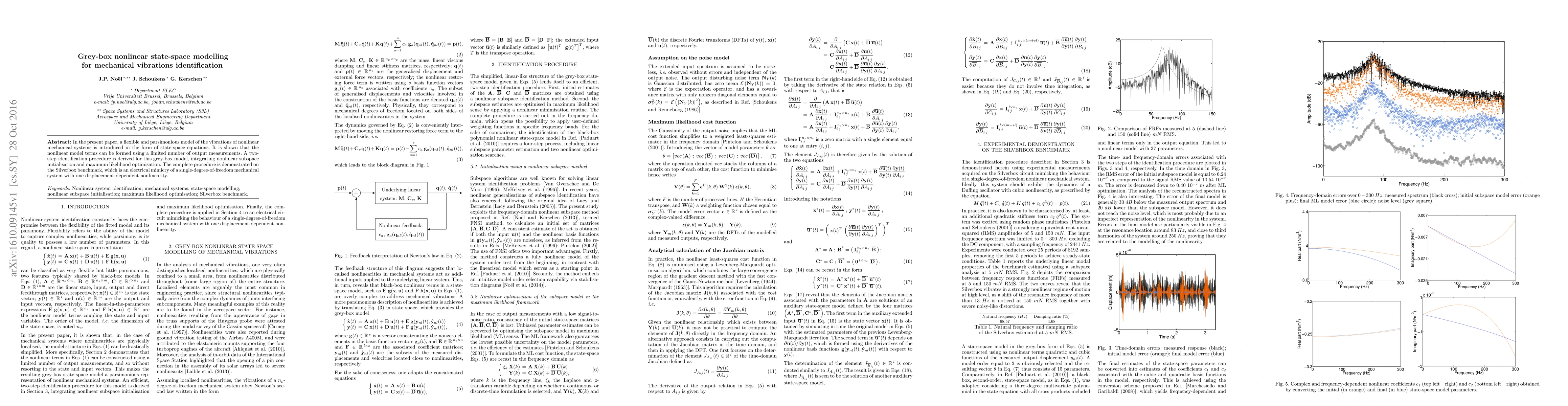 This paper introduces a grey-box nonlinear state-space model for identifying mechanical vibrations, utilizing a limited number of output measurements. It employs a two-step identification procedure combining nonlinear subspace initialisation and maximum likelihood optimisation, demonstrated on the Silverbox benchmark.