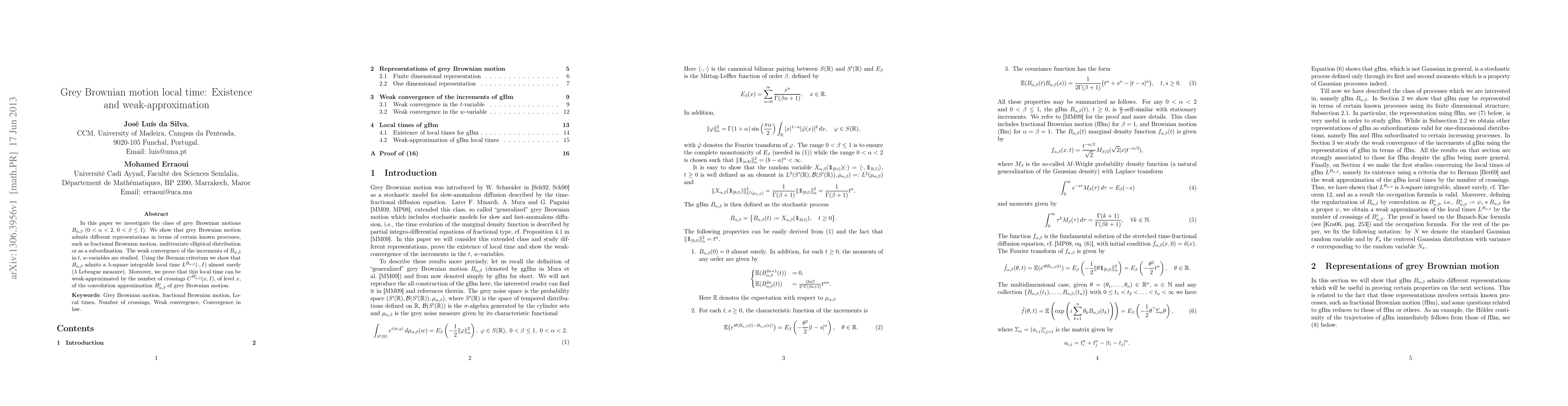 This paper explores grey Brownian motion $B_{\alpha,\beta}$ and demonstrates its existence through various known processes. It proves the weak convergence of its increments and shows the existence of a $\lambda$-square integrable local time, which can be approximated by crossings of its convolution approximation.