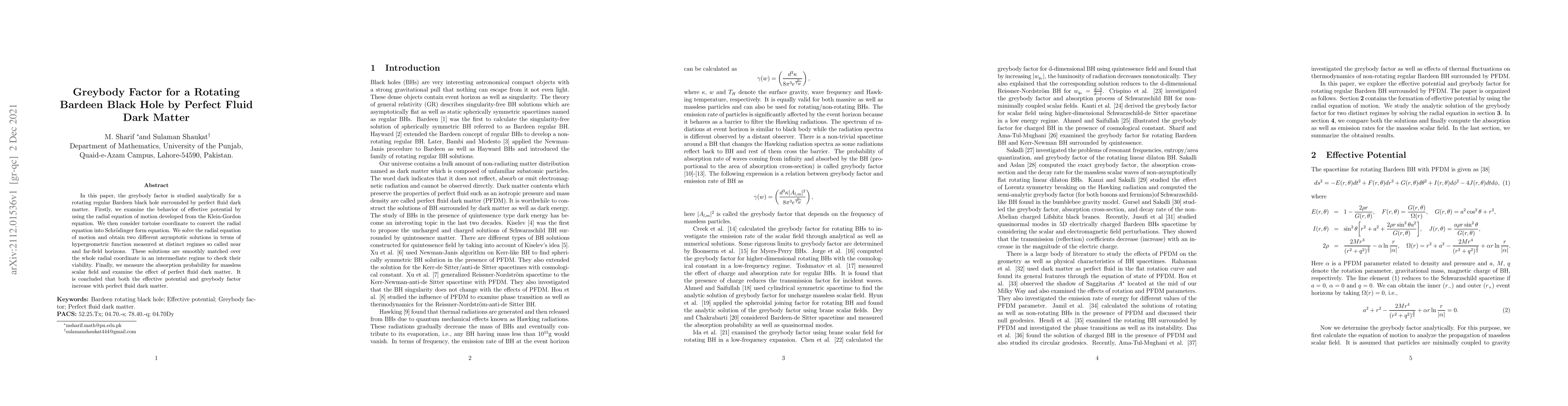 In this paper, the greybody factor is studied analytically for a rotating regular Bardeen black hole surrounded by perfect fluid dark matter. Firstly, we examine the behavior of effective potential by using the radial equation of motion developed from the Klein-Gordon equation. We then consider tortoise coordinate to convert the radial equation into Schr\"odinger form equation. We solve the radial equation of motion and obtain two different asymptotic solutions in terms of hypergeometric function measured at distinct regimes so called near and far-field horizons. These solutions are smoothly matched over the whole radial coordinate in an intermediate regime to check their viability. Finally, we measure the absorption probability for massless scalar field and examine the effect of perfect fluid dark matter. It is concluded that both the effective potential and greybody factor increase with perfect fluid dark matter.