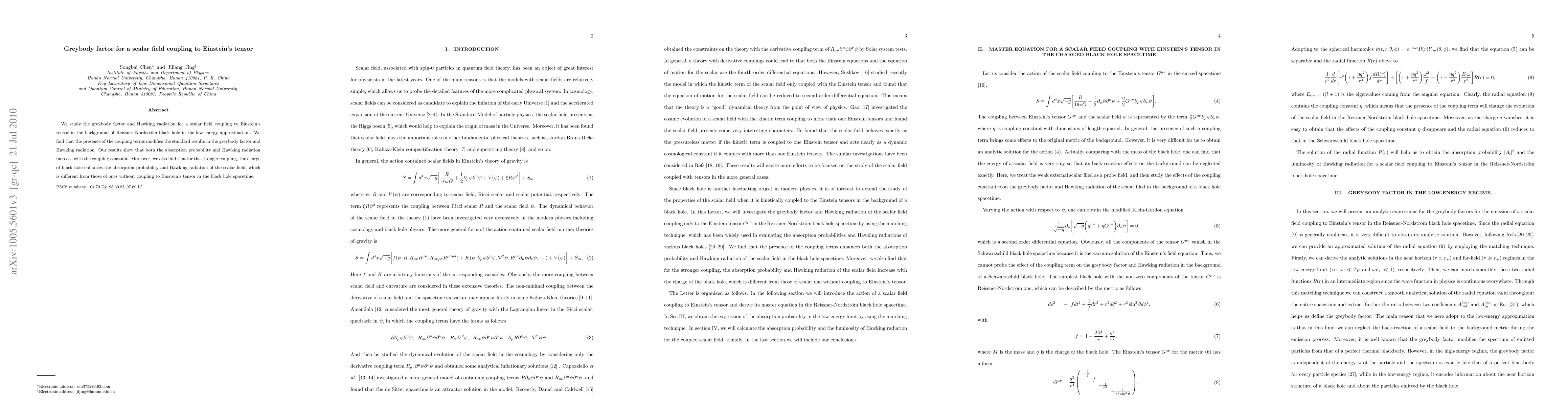 This paper investigates the greybody factor for a scalar field coupled to Einstein's tensor in a Reissner-Nordström black hole, finding that coupling modifies standard results. The study reveals that both absorption probability and Hawking radiation increase with the coupling constant, with stronger coupling enhancing these effects due to the black hole's charge.