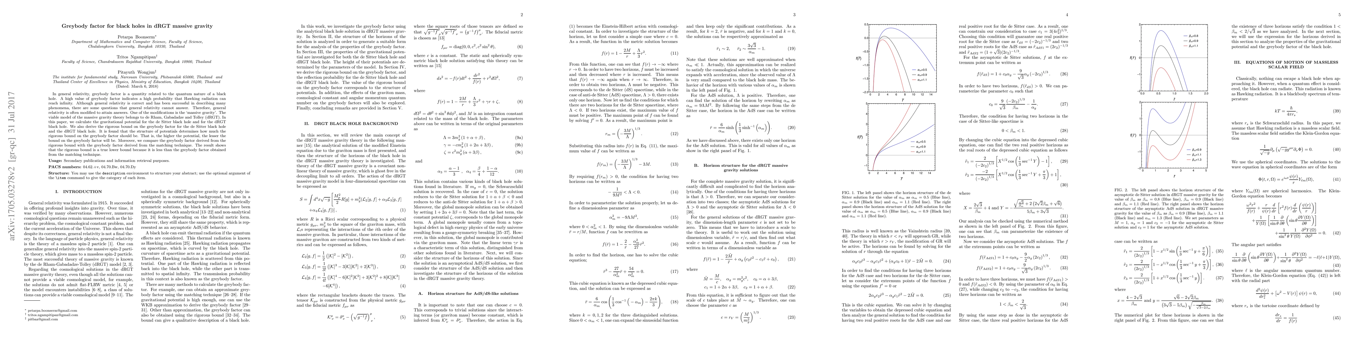 In general relativity, greybody factor is a quantity related to the quantum nature of a black hole. A high value of greybody factor indicates a high probability that Hawking radiation can reach infinity. Although general relativity is correct and has been successful in describing many phenomena, there are some questions that general relativity cannot answer. Therefore, general relativity is often modified to attain answers. One of the modifications is the `massive gravity'. The viable model of the massive gravity theory belongs to de Rham, Gabadadze and Tolley (dRGT). In this paper, we calculate the gravitational potential for the de Sitter black hole and for the dRGT black hole. We also derive the rigorous bound on the greybody factor for the de Sitter black hole and the dRGT black hole. It is found that the structure of potentials determines how much the rigorous bound on the greybody factor should be. That is, the higher the potential, the lesser the bound on the greybody factor will be. Moreover, we compare the greybody factor derived from the rigorous bound with the greybody factor derived from the matching technique. The result shows that the rigorous bound is a true lower bound because it is less than the greybody factor obtained from the matching technique.