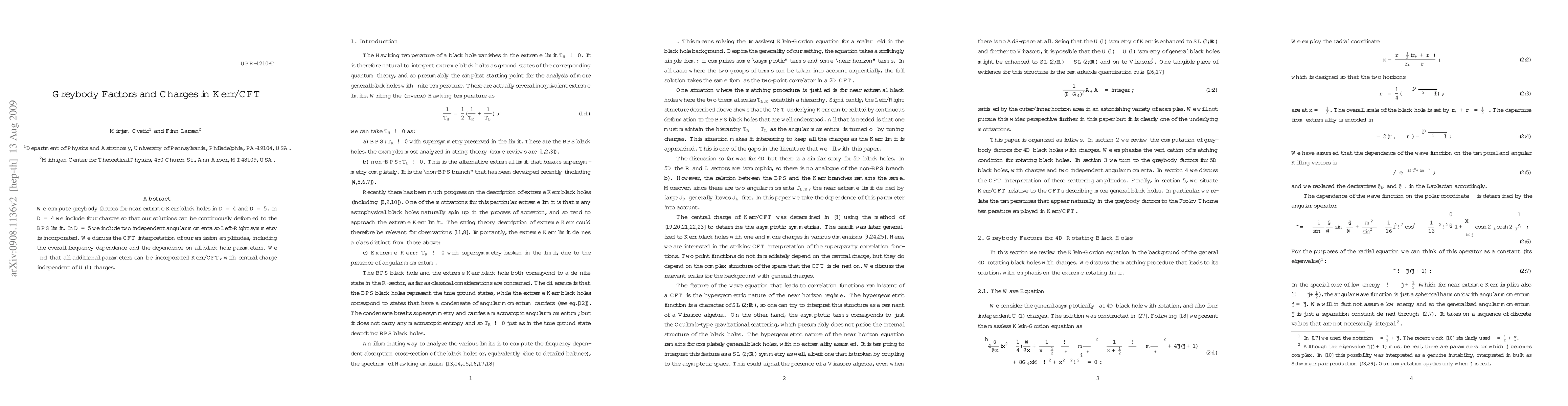 We compute greybody factors for near extreme Kerr black holes in D=4 and D=5. In D=4 we include four charges so that our solutions can be continuously deformed to the BPS limit. In D=5 we include two independent angular momenta so Left-Right symmetry is incorporated. We discuss the CFT interpretation of our emission amplitudes, including the overall frequency dependence and the dependence on all black hole parameters. We find that all additional parameters can be incorporated Kerr/CFT, with central charge independent of U(1) charges.