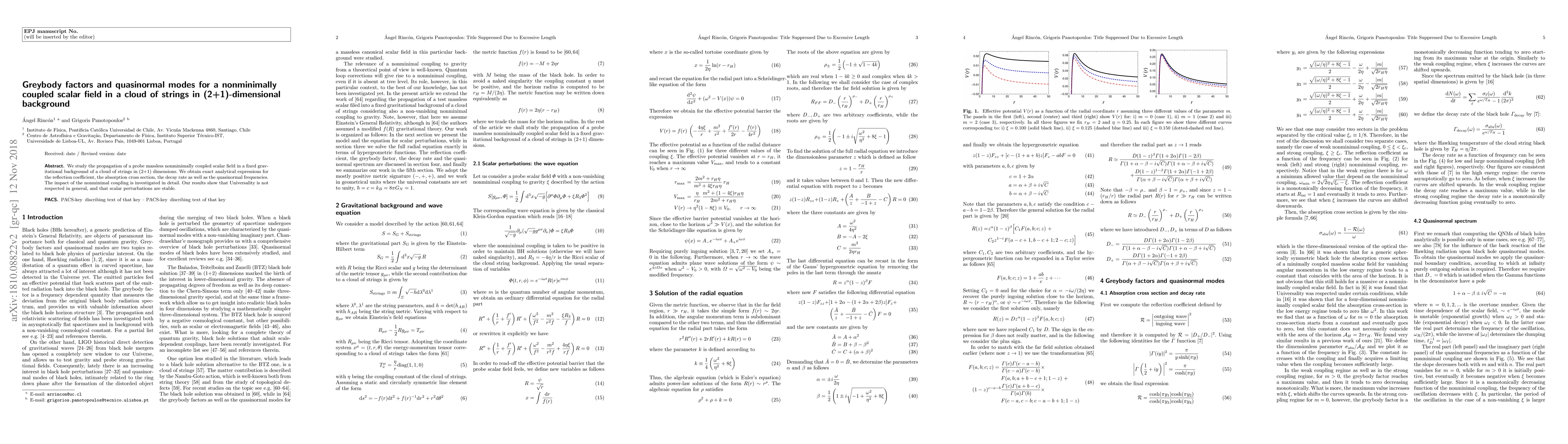 We study the propagation of a probe massless nonminimally coupled scalar field in a fixed gravitational background of a cloud of strings in (2+1) dimensions. We obtain exact analytical expressions for the reflection coefficient, the absorption cross section, the decay rate as well as the quasinormal frequencies. The impact of the nonminimal coupling is investigated in detail. Our results show that Universality is not respected in general, and that scalar perturbations are stable.