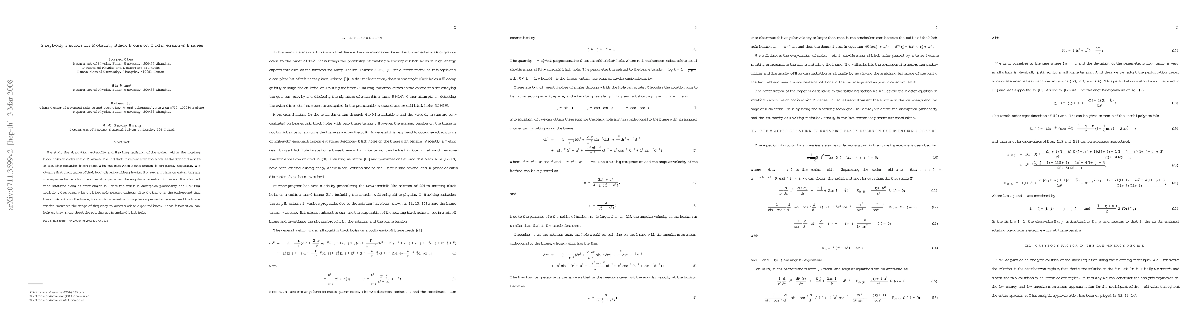 This paper investigates the absorption probability and Hawking radiation of scalar fields in rotating black holes situated on codimension-2 branes, revealing that finite brane tension alters standard Hawking radiation results. It finds that rotation enhances super-radiance, with stronger effects at higher angular momentum and varying influences on absorption probability and Hawking radiation based on the rotation angle.