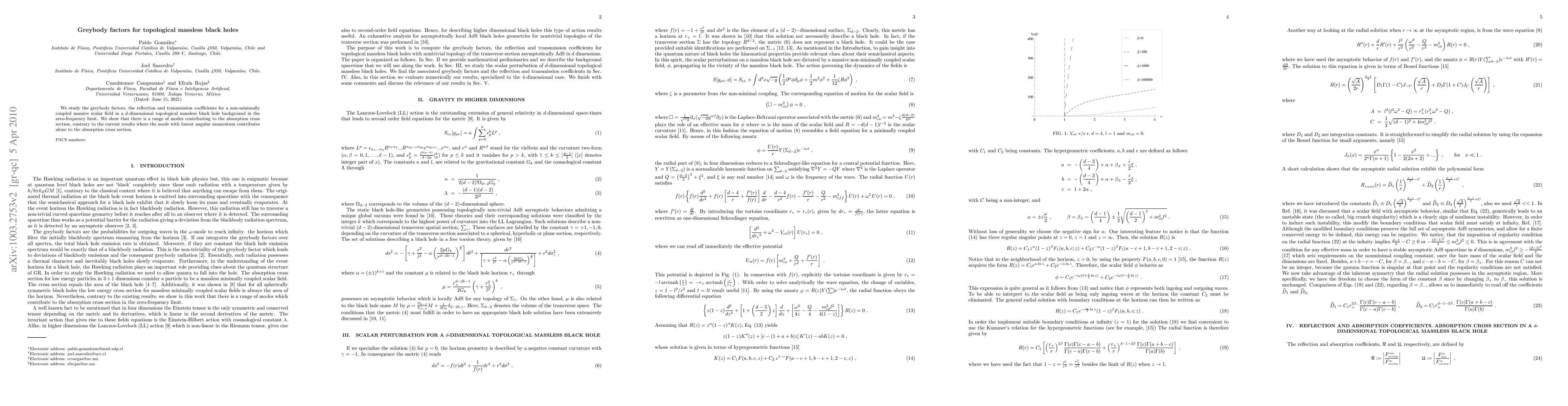 We study the reflection coefficient, the transmission coefficient and the greybody factors for black holes with topologically non trivial transverse sections in 4 and d-dimensions, in the limit of low energy. Considering a massive scalar field in a topological massless black hole background, which is non minimally coupled to the curvature and assuming the horizon geometry with a negative constant curvature. Mainly, we show that there is range of modes which contribute to the absorption cross section in the zero-frequency limit, at difference of the result existing in the literature. Where, the mode with lowest angular momentum contribute to the absorption cross section. Also we show that the condition that the sum of the reflection coefficient and the transmission coefficient is equal to one is always satisfied for these kind of black holes.