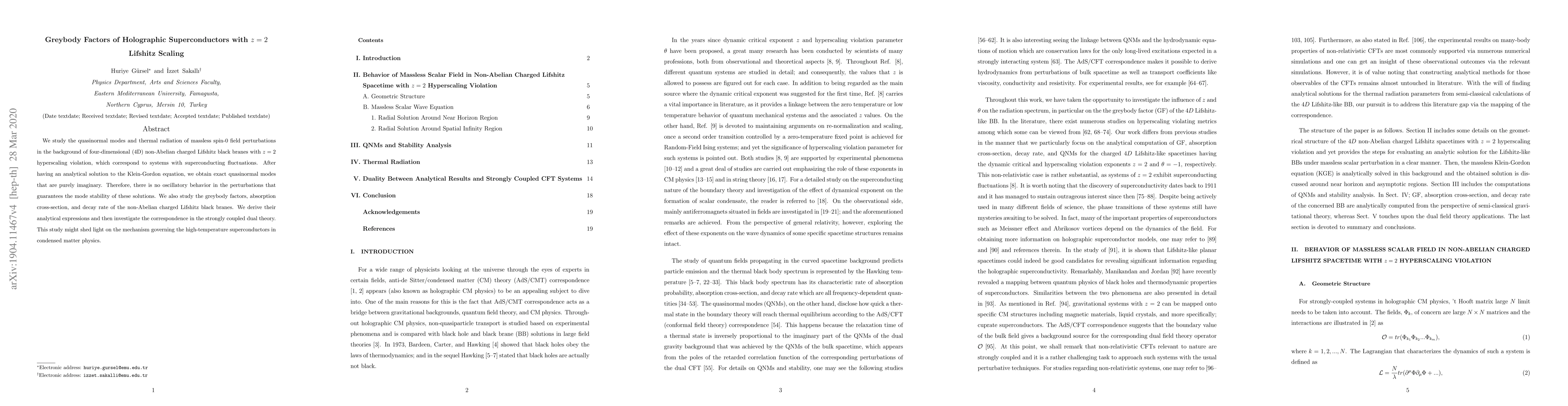 We study the quasinormal modes and thermal radiation of massless spin-0 field perturbations in the background of four-dimensional (4D) non-Abelian charged Lifshitz black branes with $z=2$ hyperscaling violation, which correspond to systems with superconducting fluctuations. After having an analytical solution to the Klein-Gordon equation, we obtain exact quasinormal modes that are purely imaginary. Therefore, there is no oscillatory behavior in the perturbations that guarantees the mode stability of these solutions. We also study the greybody factors, absorption cross-section, and decay rate of the non-Abelian charged Lifshitz black branes. We derive their analytical expressions and then investigate the correspondence in the strongly coupled dual theory. This study might shed light on the mechanism governing the high-temperature superconductors in condensed matter physics.