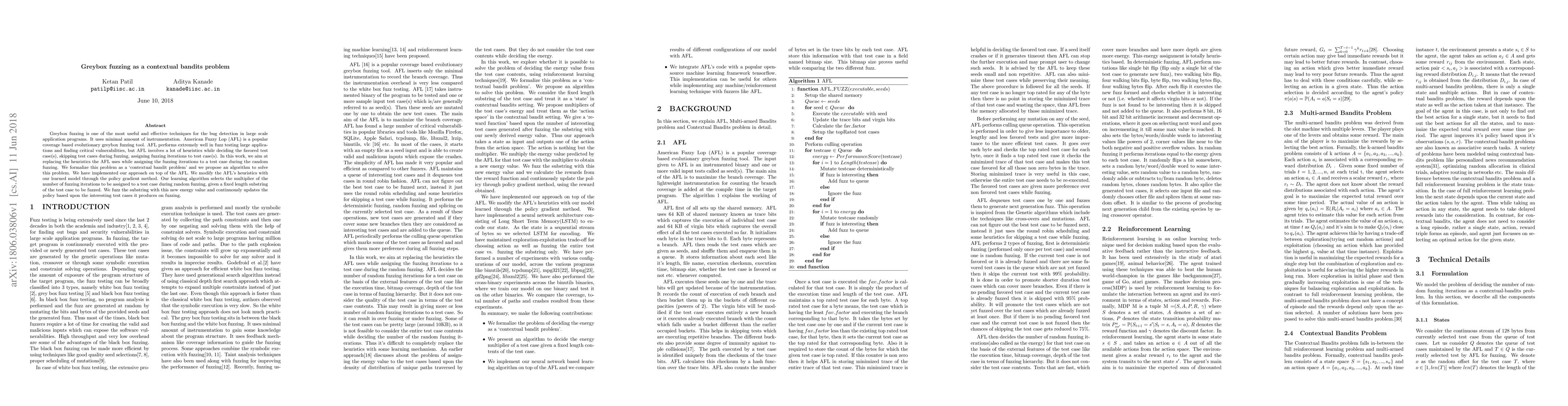 This paper proposes a contextual bandit approach to optimize greybox fuzzing in AFL, aiming to replace AFL's heuristics for assigning fuzzing iterations to test cases. The new algorithm learns to select the optimal multiplier for fuzzing iterations based on the context of the test case, improving the efficiency and effectiveness of vulnerability detection.