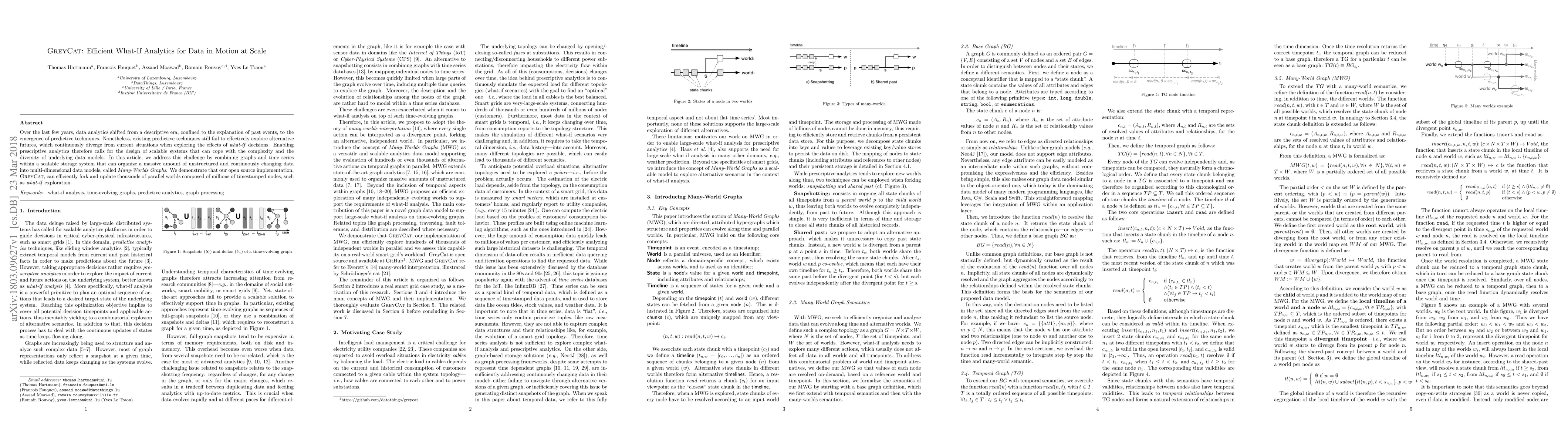 Over the last few years, data analytics shifted from a descriptive era, confined to the explanation of past events, to the emergence of predictive techniques. Nonetheless, existing predictive techniques still fail to effectively explore alternative futures, which continuously diverge from current situations when exploring the effects of what-if decisions. Enabling prescriptive analytics therefore calls for the design of scalable systems that can cope with the complexity and the diversity of underlying data models. In this article, we address this challenge by combining graphs and time series within a scalable storage system that can organize a massive amount of unstructured and continuously changing data into multi-dimensional data models, called Many-Worlds Graphs. We demonstrate that our open source implementation, GreyCat, can efficiently fork and update thousands of parallel worlds composed of millions of timestamped nodes, such as what-if exploration.