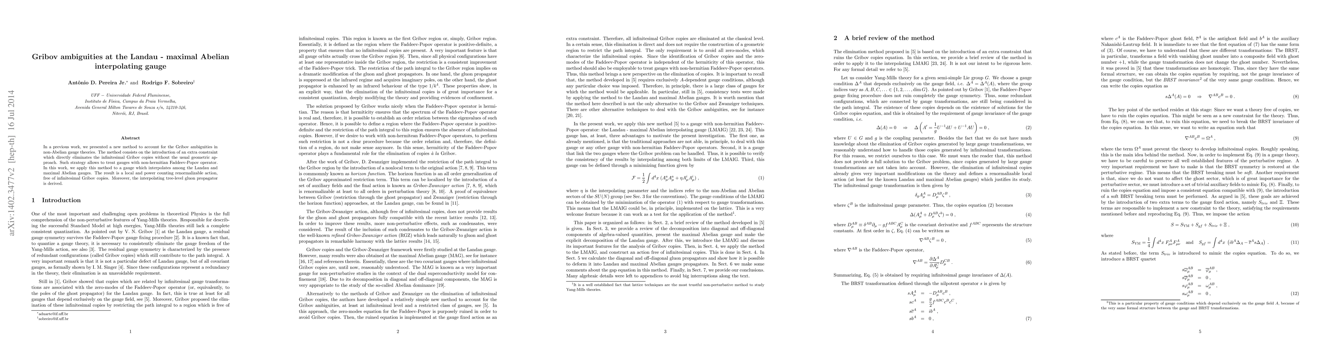 In a previous work, we presented a new method to account for the Gribov ambiguities in non-Abelian gauge theories. The method consists on the introduction of an extra constraint which directly eliminates the infinitesimal Gribov copies without the usual geometric approach. Such strategy allows to treat gauges with non-hermitian Faddeev-Popov operator. In this work, we apply this method to a gauge which interpolates among the Landau and maximal Abelian gauges. The result is a local and power counting renormalizable action, free of infinitesimal Gribov copies. Moreover, the interpolating tree-level gluon propagator is derived.