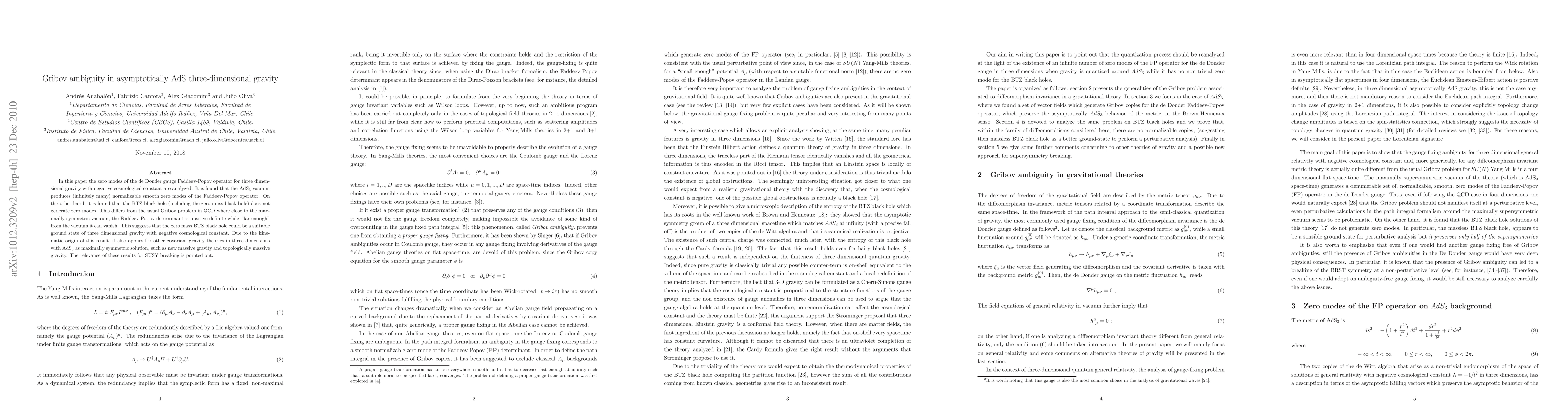 In this paper the zero modes of the de Donder gauge Faddeev-Popov operator for three dimensional gravity with negative cosmological constant are analyzed. It is found that the three dimensional AdS vacuum produces (infinitely many) normalizable, smooth zero modes of the Faddeev-Popov operator. On the other hand, it is found that the BTZ black hole (including the zero mass black hole) does not generate zero modes. This differs from the usual Gribov problem in QCD where close to the maximally symmetric vacuum, the Faddeev-Popov determinant is positive definite while "far enough" from the vacuum it can vanish. This suggests that the zero mass BTZ black hole could be a suitable ground state of three dimensional gravity with negative cosmological constant. Due to the kinematic origin of this result, it also applies for other covariant gravity theories in three dimensions with AdS_3 as maximally symmetric solution, such as new massive gravity and topologically massive gravity. The relevance of these results for SUSY breaking is pointed out.