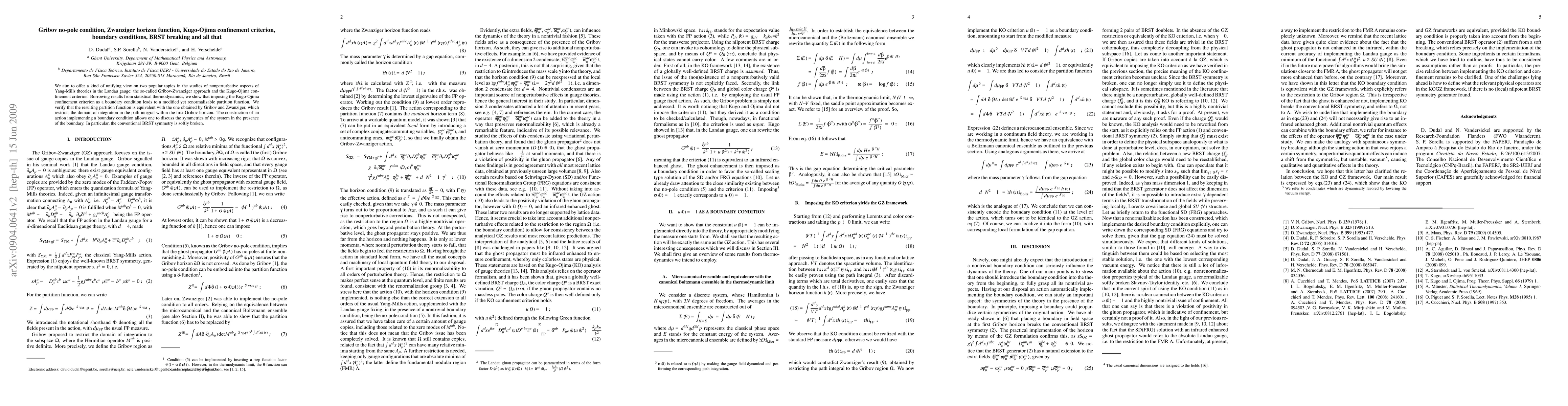 We aim to offer a kind of unifying view on two popular topics in the studies of nonperturbative aspects of Yang-Mills theories in the Landau gauge: the so-called Gribov-Zwanziger approach and the Kugo-Ojima confinement criterion. Borrowing results from statistical thermodynamics, we show that imposing the Kugo-Ojima confinement criterion as a boundary condition leads to a modified yet renormalizable partition function. We verify that the resulting partition function is equivalent with the one obtained by Gribov and Zwanziger, which restricts the domain of integration in the path integral within the first Gribov horizon. The construction of an action implementing a boundary condition allows one to discuss the symmetries of the system in the presence of the boundary. In particular, the conventional BRST symmetry is softly broken.