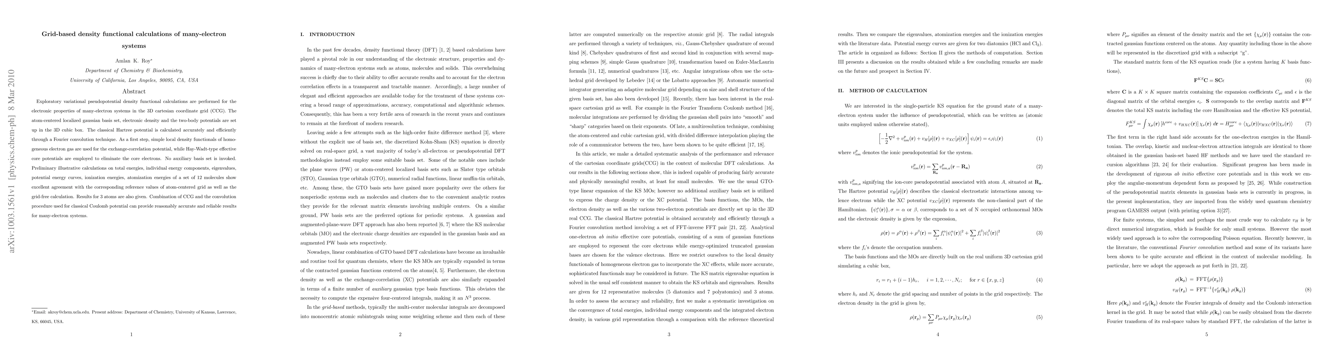 This paper explores grid-based density functional calculations for many-electron systems using a 3D Cartesian coordinate grid, achieving accurate results for electronic properties and energy components through Fourier convolution techniques. Preliminary calculations on molecules and atoms show good agreement with reference values, demonstrating the potential of this method.