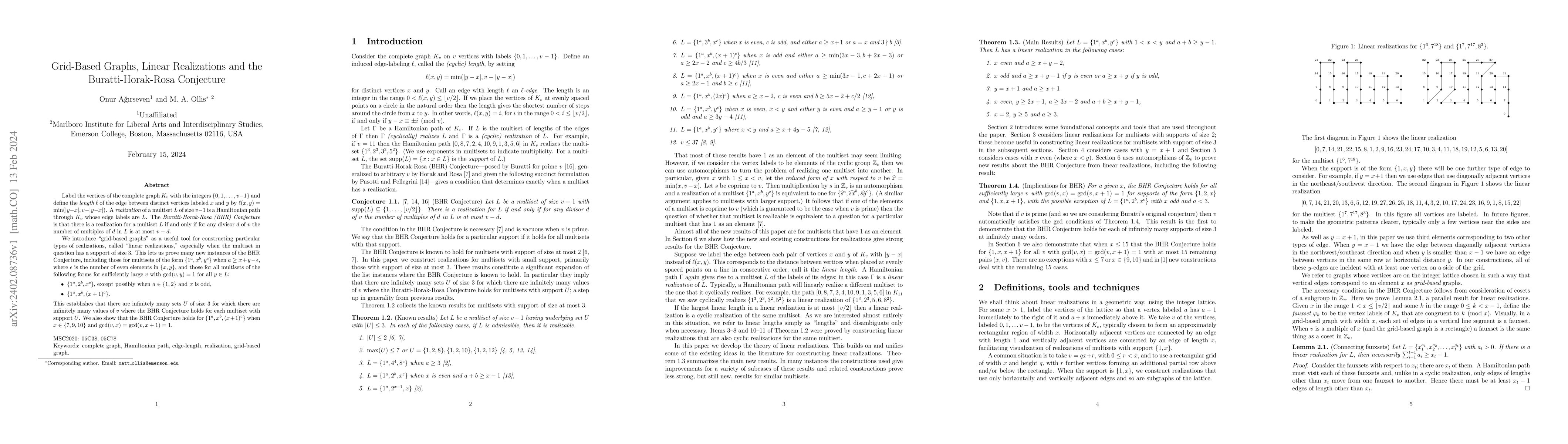 This paper introduces "grid-based graphs" to construct linear realizations for Hamiltonian paths in complete graphs, proving new instances of the Buratti-Horak-Rosa Conjecture. It establishes the conjecture for multisets of specific forms and shows it holds for certain values of $v$ and specific multiset supports.
