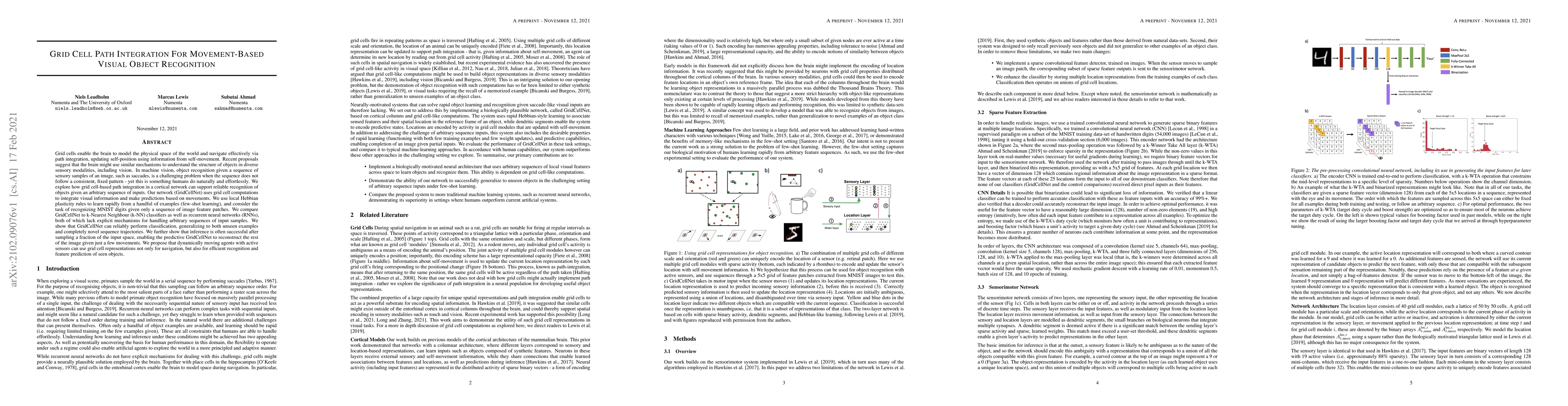 This paper investigates how grid cell-based path integration in neural networks can enable reliable object recognition from arbitrary sequences of visual inputs, demonstrating the effectiveness of GridCellNet in classifying MNIST digits from feature patches. The proposed model outperforms k-NN and RNNs by generalizing to unseen examples and reconstructing images from limited input samples.