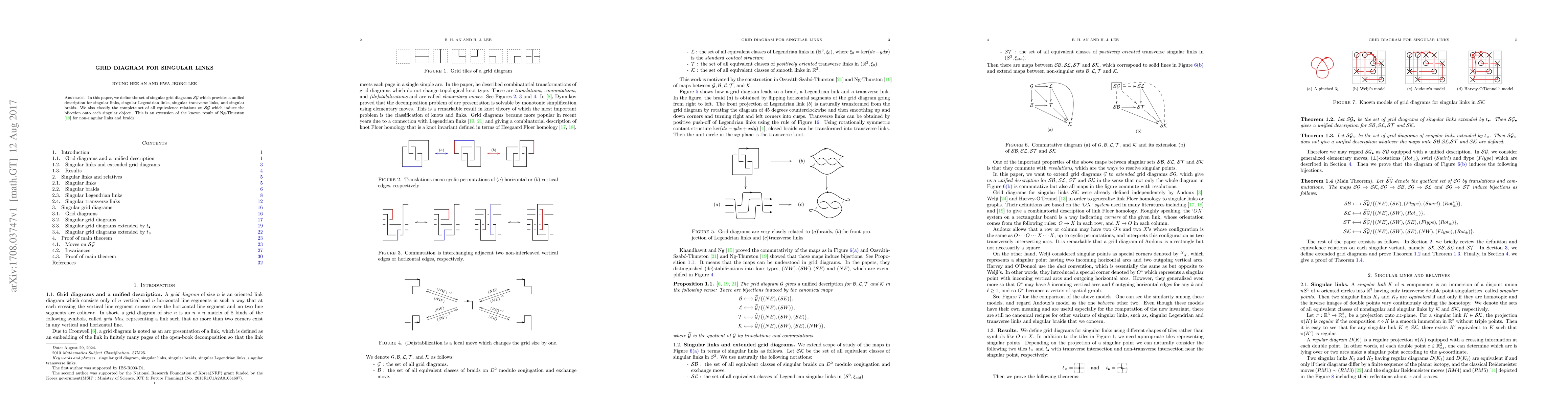 This paper introduces singular grid diagrams $\mathcal{SG}$ for describing singular links and related objects, and classifies equivalence relations on these diagrams that correspond to singular structures, extending Ng-Thurston results for non-singular cases.