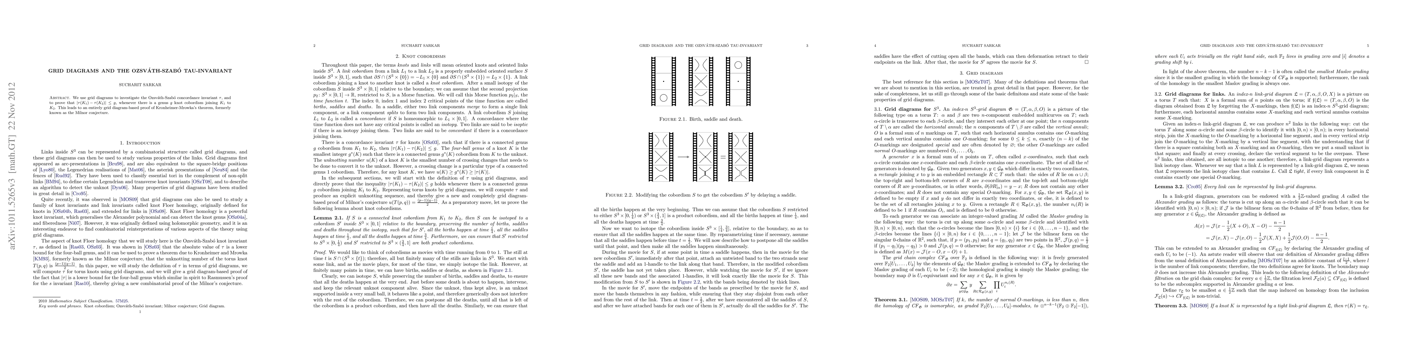 This paper employs grid diagrams to analyze the Ozsvath-Szabo tau-invariant and demonstrates that the absolute difference between tau values of two knots connected by a genus g cobordism is less than or equal to g. This method ultimately provides a grid diagram-based proof of Kronheimer-Mrowka's theorem, previously known as the Milnor conjecture.