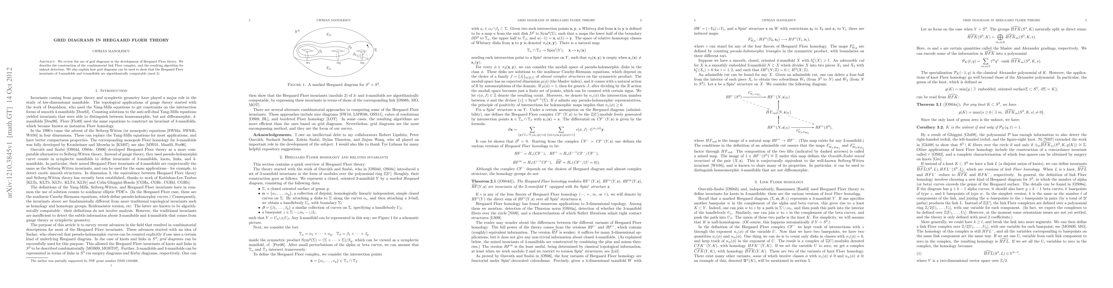 This paper reviews the application of grid diagrams in Heegaard Floer theory, detailing the construction of the combinatorial link Floer complex and an algorithm for unknot detection. It also illustrates how grid diagrams enable the computational (mod 2) nature of Heegaard Floer invariants for 3-manifolds and 4-manifolds.