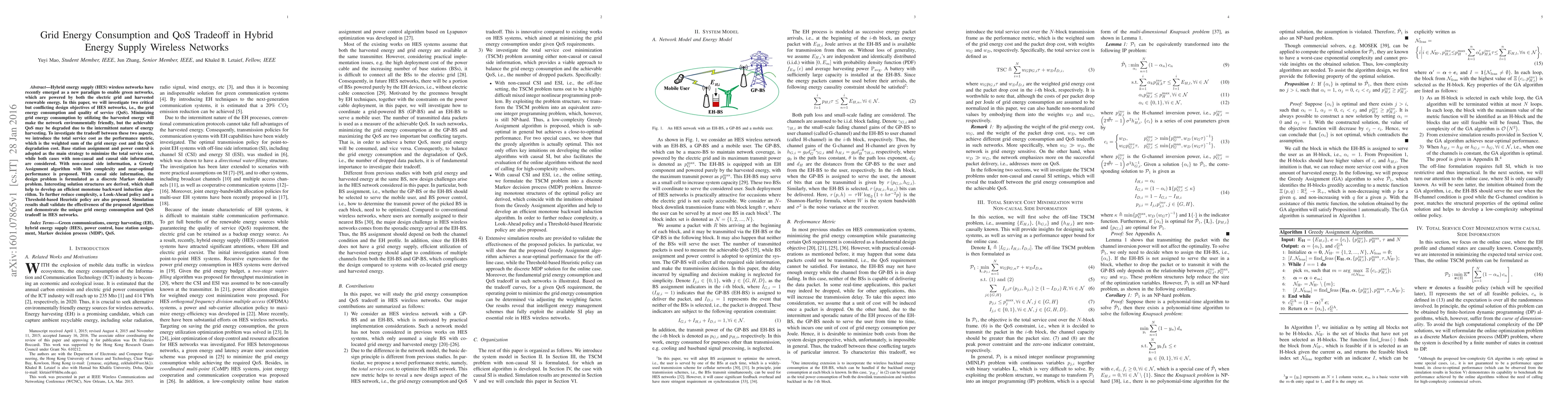 This paper investigates the tradeoff between minimizing grid energy consumption and maintaining quality of service in hybrid energy supply wireless networks. It proposes various algorithms to optimize the total service cost, a weighted sum of grid energy cost and QoS degradation cost.