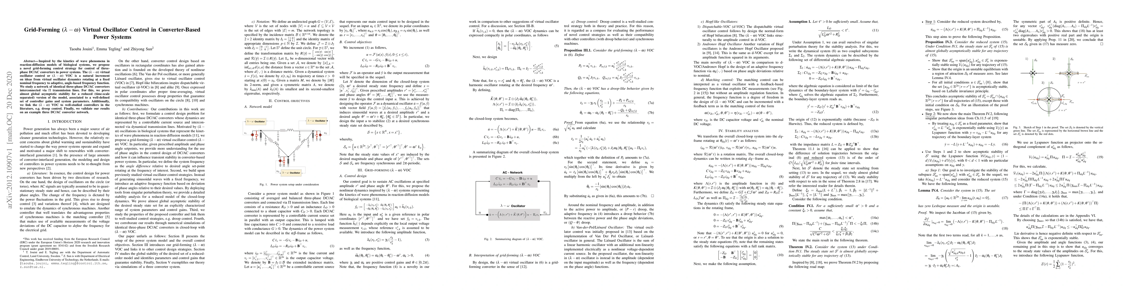 Inspired by the kinetics of wave phenomena in reaction-diffusion models of biological systems, we propose a novel grid-forming control strategy for control of three-phase DC/AC converters in power systems. The ($\lambda-\omega$) virtual oscillator control or (lambda-omega) VOC is a natural increment on ideas from virtual oscillator dynamics rotating at a fixed nominal frequency to adaptive, angle-based frequency function. We study a network of identical three-phase DC/AC converters interconnected via $\Pi$ transmission lines. For this, we prove almost global asymptotic stability for a reduced (time-scale separated) version of the model, associated to a well-defined set of controller gains and system parameters. Additionally, we link the (\lambda-\omega) VOC to well-studied controllers in the literature, e.g. droop control. Finally, we validate our results on an example three DC/AC converter network.
