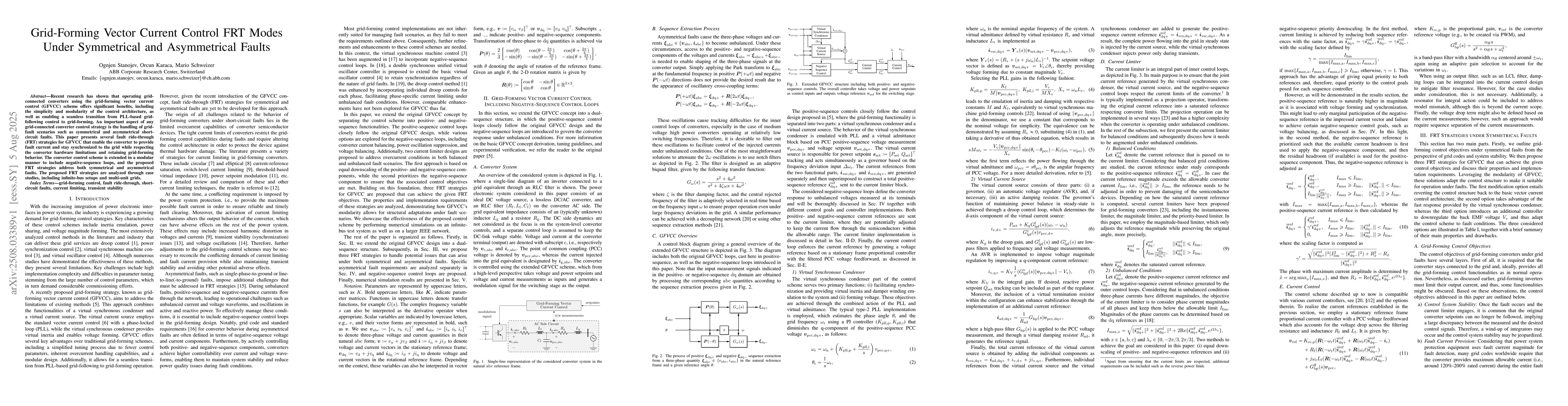 Recent research has shown that operating grid-connected converters using the grid-forming vector current control (GFVCC) scheme offers significant benefits, including the simplicity and modularity of the control architecture, as well as enabling a seamless transition from PLL-based grid-following control to grid-forming. An important aspect of any grid-connected converter control strategy is the handling of grid-fault scenarios such as symmetrical and asymmetrical short-circuit faults. This paper presents several fault ride-through (FRT) strategies for GFVCC that enable the converter to provide fault current and stay synchronized to the grid while respecting the converter hardware limitations and retaining grid-forming behavior. The converter control scheme is extended in a modular manner to include negative-sequence loops, and the proposed FRT strategies address both symmetrical and asymmetrical faults. The proposed FRT strategies are analyzed through case studies, including infinite-bus setups and multi-unit grids.