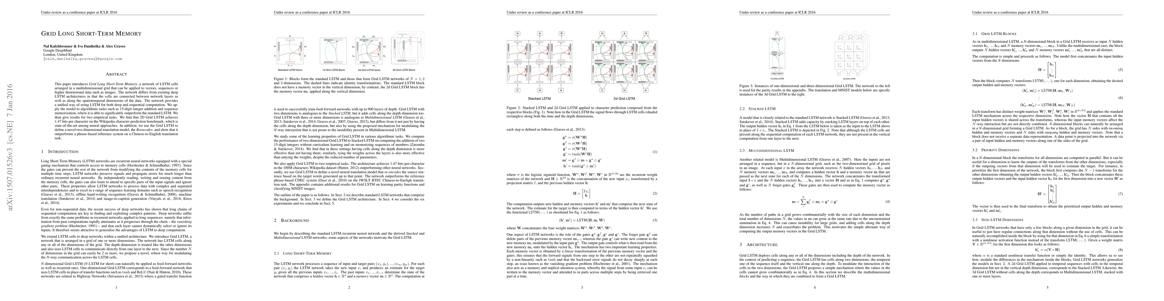 This paper introduces Grid Long Short-Term Memory, a network of LSTM cells arranged in a multidimensional grid that can be applied to vectors, sequences or higher dimensional data such as images. The network differs from existing deep LSTM architectures in that the cells are connected between network layers as well as along the spatiotemporal dimensions of the data. The network provides a unified way of using LSTM for both deep and sequential computation. We apply the model to algorithmic tasks such as 15-digit integer addition and sequence memorization, where it is able to significantly outperform the standard LSTM. We then give results for two empirical tasks. We find that 2D Grid LSTM achieves 1.47 bits per character on the Wikipedia character prediction benchmark, which is state-of-the-art among neural approaches. In addition, we use the Grid LSTM to define a novel two-dimensional translation model, the Reencoder, and show that it outperforms a phrase-based reference system on a Chinese-to-English translation task.