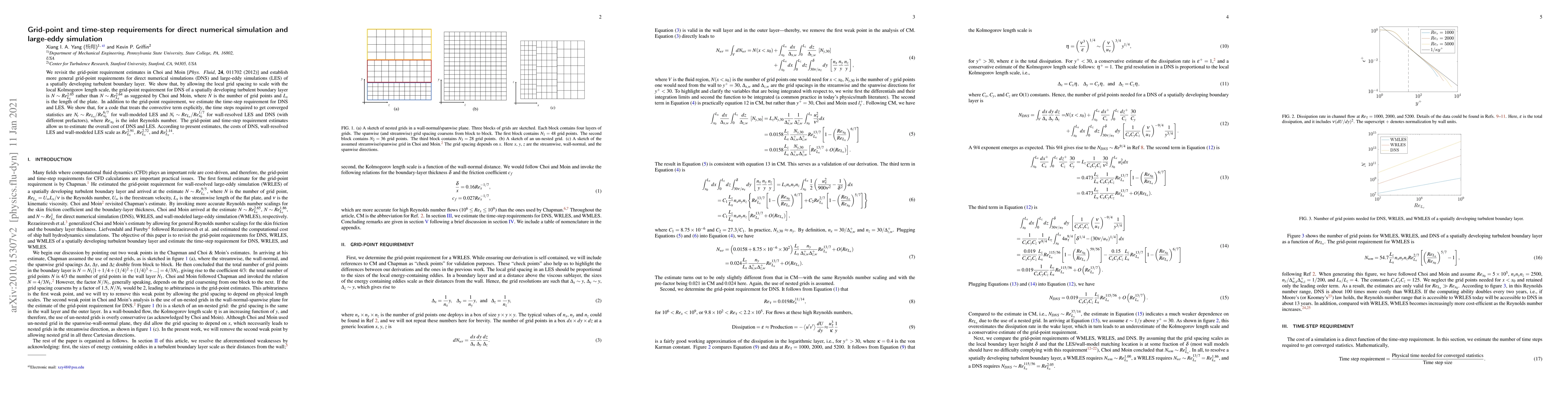 This paper revises grid-point and time-step requirements for DNS and LES of turbulent boundary layers, showing that DNS requires $N\sim Re_{L_x}^{2.05}$ grid points instead of $N\sim Re_{L_x}^{2.64}$. It also estimates time steps as $N_t\sim Re_{L_x}/Re_{x_0}^{6/7}$ for wall-modeled LES and $N_t\sim Re_{L_x}/Re_{x_0}^{1/7}$ for wall-resolved LES and DNS.