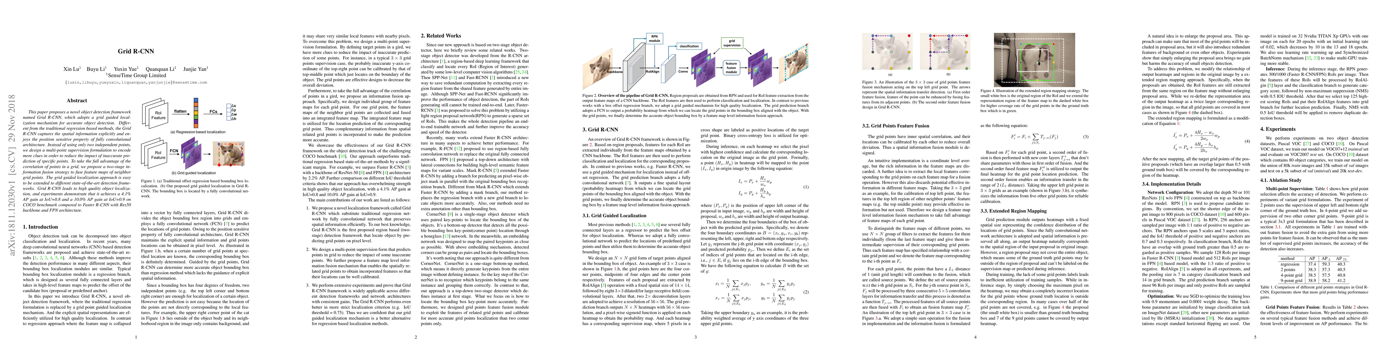 Grid R-CNN introduces a novel object detection framework that uses a grid-guided localization mechanism for precise object detection, achieving significant improvements over traditional regression methods. It employs multi-point supervision and a two-stage information fusion strategy, resulting in a 4.1% AP gain at IoU=0.8 and a 10.0% AP gain at IoU=0.9 on the COCO benchmark compared to Faster R-CNN.