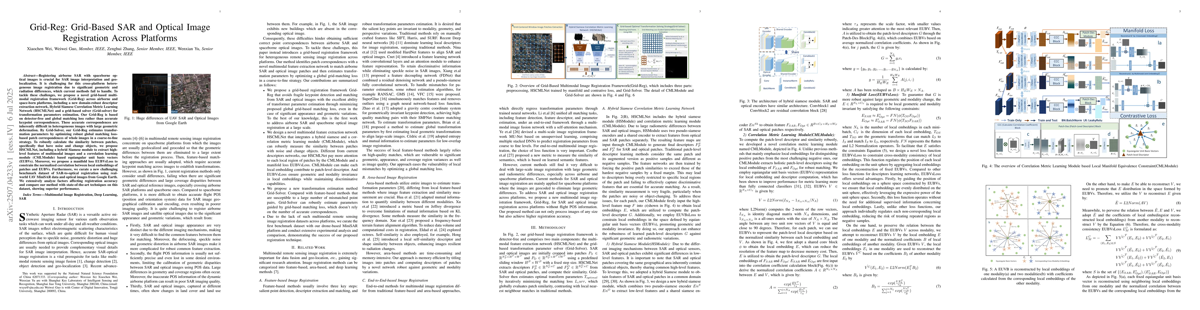 Registering airborne SAR with spaceborne optical images is crucial for SAR image interpretation and geo-localization. It is challenging for this cross-platform heterogeneous image registration due to significant geometric and radiation differences, which current methods fail to handle. To tackle these challenges, we propose a novel grid-based multimodal registration framework (Grid-Reg) across airborne and space-born platforms, including a new domain-robust descriptor extraction network, Hybrid Siamese Correlation Metric Learning Network (HSCMLNet) and a grid-based solver (Grid-solver) for transformation parameters estimation. Our Grid-Reg is based on detector-free and global matching loss rather than accurate keypoint correspondences. These accurate correspondences are inherently difficult in heterogeneous images with large geometric deformation. By Grid-Solver, our Grid-Reg estimates transformation parameters by optimizing robust global matching loss-based patch correspondences of whole images in a coarse-to-fine strategy. To robustly calculate the similarity between patches, specifically that have noise and change objects, we propose HSCMLNet, including a hybrid Siamese module to extract high-level features of multimodal images and a correlation learning module (CMLModule) based equiangular unit basis vectors (EUBVs). Moreover, we propose a manifold loss EUBVsLoss to constrain the normalized correlation between local embeddings of patches and EUBVs. Furthermore, we curate a new challenging benchmark dataset of SAR-to-optical registration using real-world UAV MiniSAR data and optical images from Google Earth. We extensively analyze factors affecting registration accuracy and compare our method with state-of-the-art techniques on this dataset, showing superior performance.