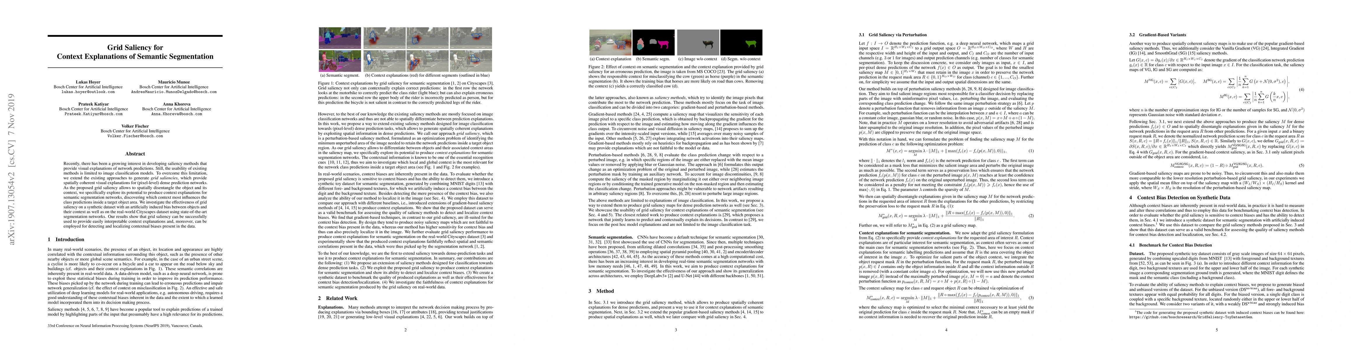 This paper proposes an extension of saliency methods to generate grid saliencies for dense prediction networks, specifically semantic segmentation, to provide spatially coherent visual explanations. The results demonstrate the effectiveness of grid saliency in producing interpretable context explanations and detecting contextual biases in both synthetic and real-world datasets.