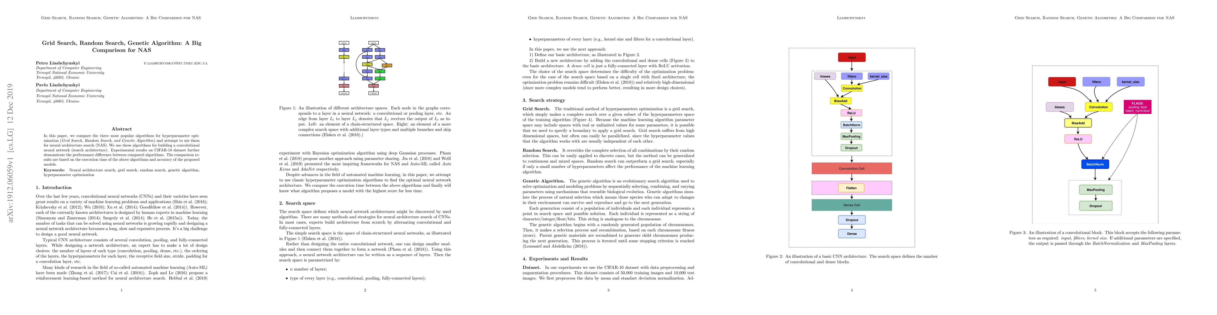 This paper compares Grid Search, Random Search, and Genetic Algorithm for hyperparameter optimization in neural architecture search on the CIFAR-10 dataset, highlighting performance differences and execution time variations between algorithms.