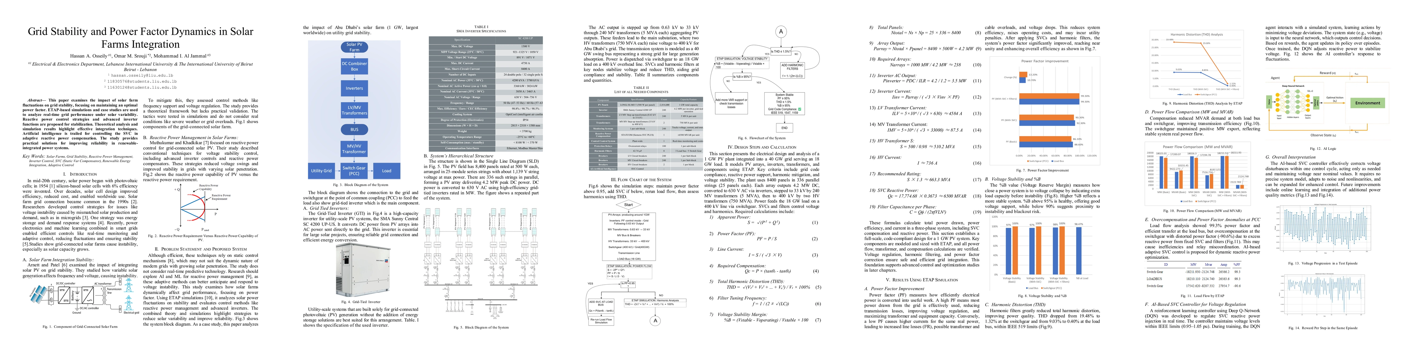 This paper examines the impact of solar farm fluctuations on grid stability, focusing on maintaining an optimal power factor. ETAP-based simulations and case studies are used to analyze real-time grid performance under solar variability. Reactive power control strategies and advanced inverter functions are proposed for stabilization. Theoretical analysis and simulation results highlight effective integration techniques. Artificial intelligence is trailed for controlling the SVC in adaptive reactive power compensation. The study provides practical solutions for improving reliability in renewable-integrated power systems.