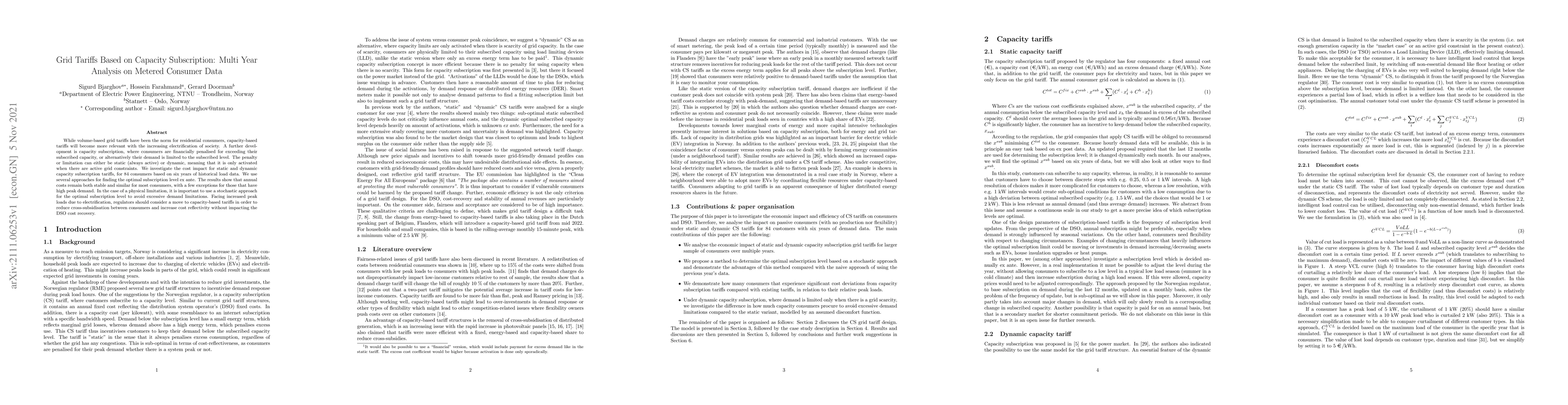 This study analyzes the cost impact of static and dynamic capacity subscription tariffs on 84 consumers over six years, finding that annual costs remain stable for most, though high peak demand consumers may face exceptions. Regulators should consider capacity-based tariffs to reduce cross-subsidization and increase cost reflectivity amidst rising peak loads.