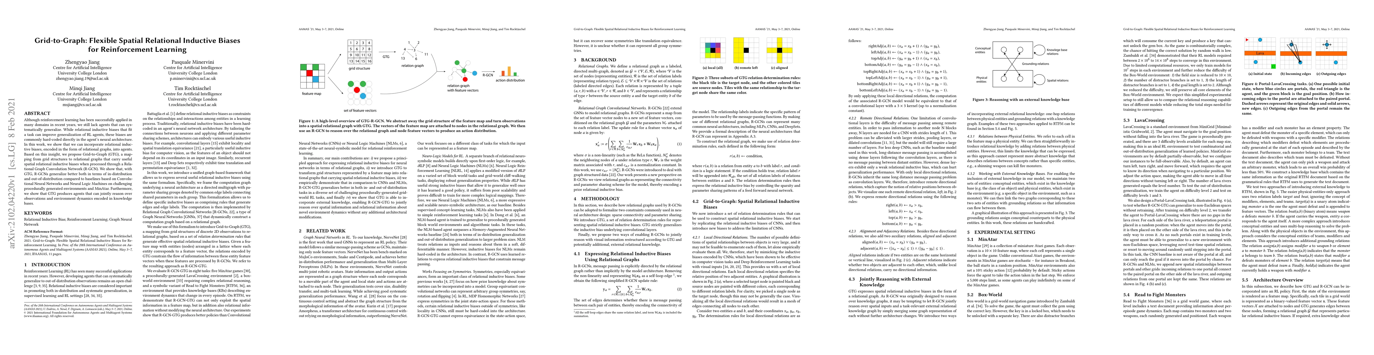 This paper proposes Grid-to-Graph (GTG), a method to map grid structures to relational graphs, enhancing reinforcement learning agents' generalization through spatial relational inductive biases. The approach, combined with a Relational Graph Convolution Network (R-GCN), outperforms baselines in procedurally generated environments and MinAtar, demonstrating improved generalization and joint reasoning capabilities.