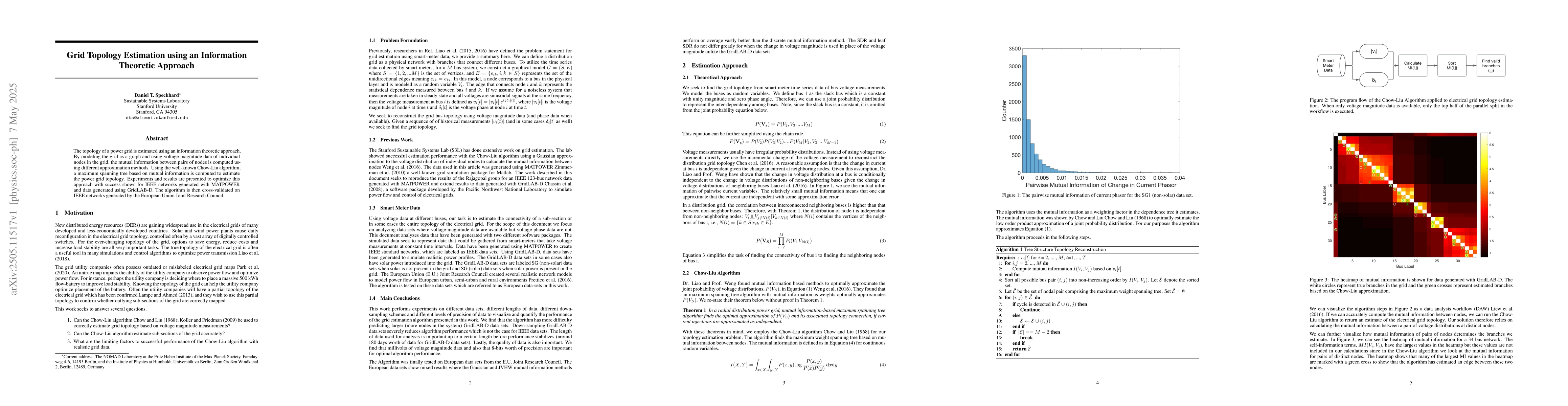 An information theoretic approach using mutual information and the Chow-Liu algorithm for grid topology estimation.