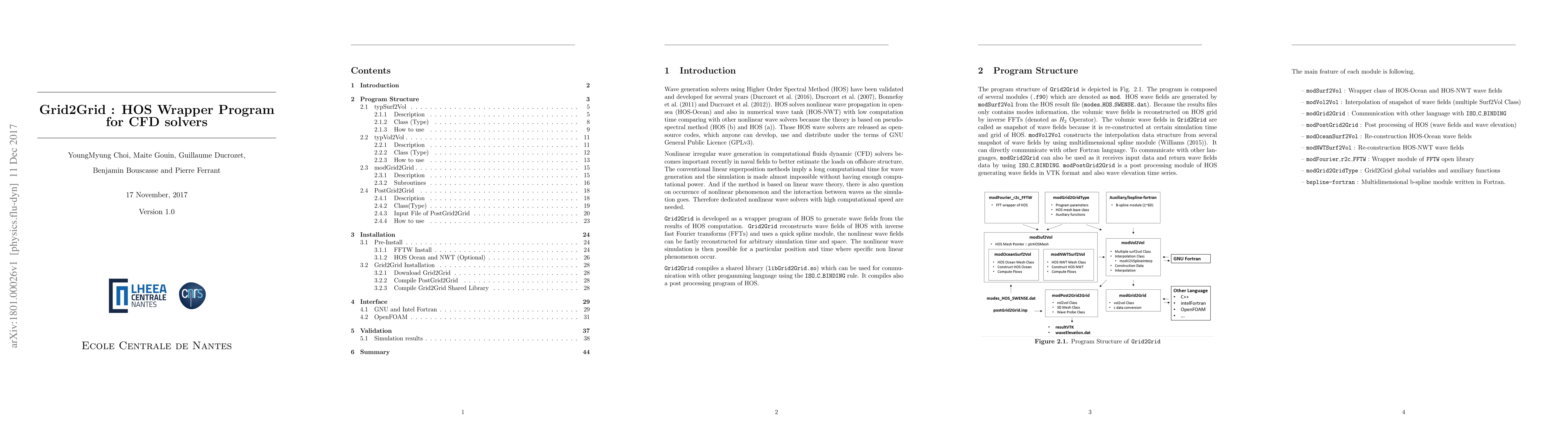 Grid2Grid is a wrapper program that uses Higher Order Spectral Method to generate nonlinear wave fields for computational fluid dynamics (CFD) simulations, allowing for fast and accurate reconstruction of wave fields at arbitrary positions and times.