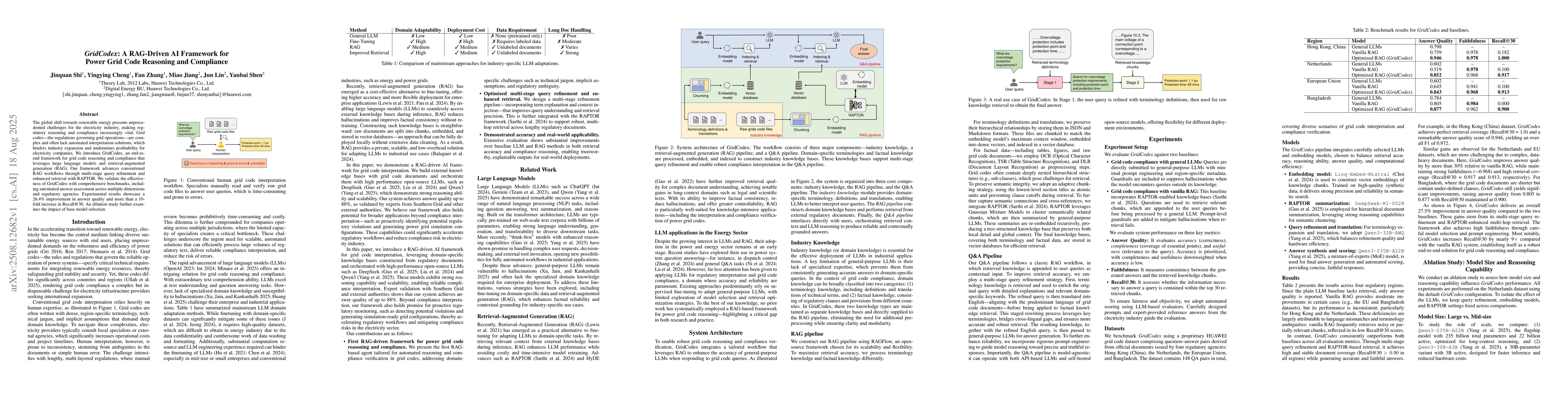 The global shift towards renewable energy presents unprecedented challenges for the electricity industry, making regulatory reasoning and compliance increasingly vital. Grid codes, the regulations governing grid operations, are complex and often lack automated interpretation solutions, which hinders industry expansion and undermines profitability for electricity companies. We introduce GridCodex, an end to end framework for grid code reasoning and compliance that leverages large language models and retrieval-augmented generation (RAG). Our framework advances conventional RAG workflows through multi stage query refinement and enhanced retrieval with RAPTOR. We validate the effectiveness of GridCodex with comprehensive benchmarks, including automated answer assessment across multiple dimensions and regulatory agencies. Experimental results showcase a 26.4% improvement in answer quality and more than a 10 fold increase in recall rate. An ablation study further examines the impact of base model selection.