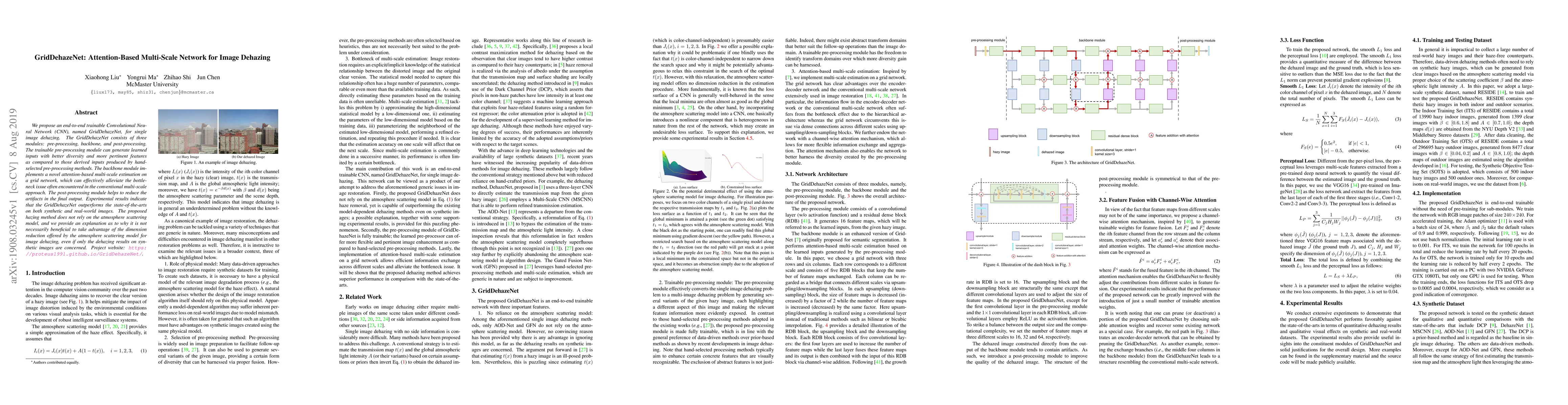 GridDehazeNet is an end-to-end trainable CNN for single image dehazing, featuring a pre-processing module, an attention-based multi-scale backbone, and a post-processing module to reduce artifacts. It outperforms state-of-the-art methods without relying on the atmosphere scattering model.