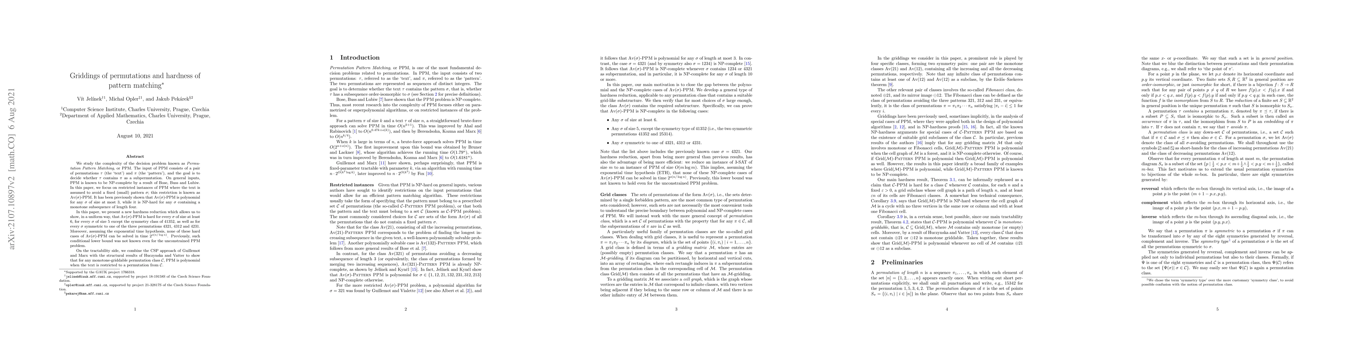 We study the complexity of the decision problem known as Permutation Pattern Matching, or PPM. The input of PPM consists of a pair of permutations $\tau$ (the `text') and $\pi$ (the `pattern'), and the goal is to decide whether $\tau$ contains $\pi$ as a subpermutation. On general inputs, PPM is known to be NP-complete by a result of Bose, Buss and Lubiw. In this paper, we focus on restricted instances of PPM where the text is assumed to avoid a fixed (small) pattern $\sigma$; this restriction is known as Av($\sigma$)-PPM. It has been previously shown that Av($\sigma$)-PPM is polynomial for any $\sigma$ of size at most 3, while it is NP-hard for any $\sigma$ containing a monotone subsequence of length four. In this paper, we present a new hardness reduction which allows us to show, in a uniform way, that Av($\sigma$)-PPM is hard for every $\sigma$ of size at least 6, for every $\sigma$ of size 5 except the symmetry class of $41352$, as well as for every $\sigma$ symmetric to one of the three permutations $4321$, $4312$ and $4231$. Moreover, assuming the exponential time hypothesis, none of these hard cases of Av($\sigma$)-PPM can be solved in time $2^{o(n/\log n)}$. Previously, such conditional lower bound was not known even for the unconstrained PPM problem. On the tractability side, we combine the CSP approach of Guillemot and Marx with the structural results of Huczynska and Vatter to show that for any monotone-griddable permutation class C, PPM is polynomial when the text is restricted to a permutation from C.