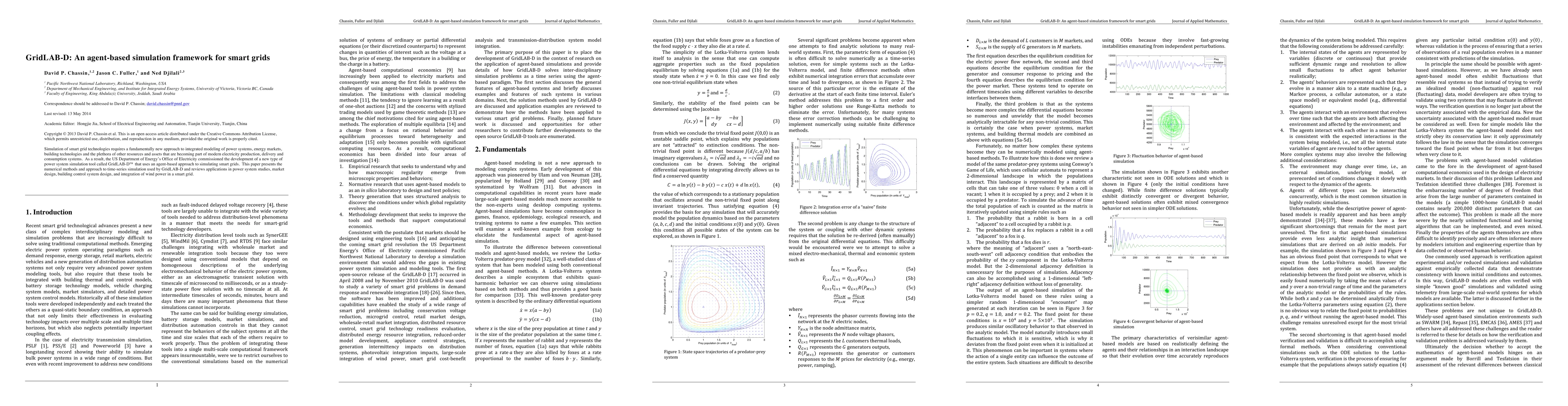 GridLAB-D is an agent-based simulation framework developed by the US Department of Energy to model smart grid technologies. It employs advanced numerical methods for time-series simulation to integrate power systems, energy markets, and building technologies.