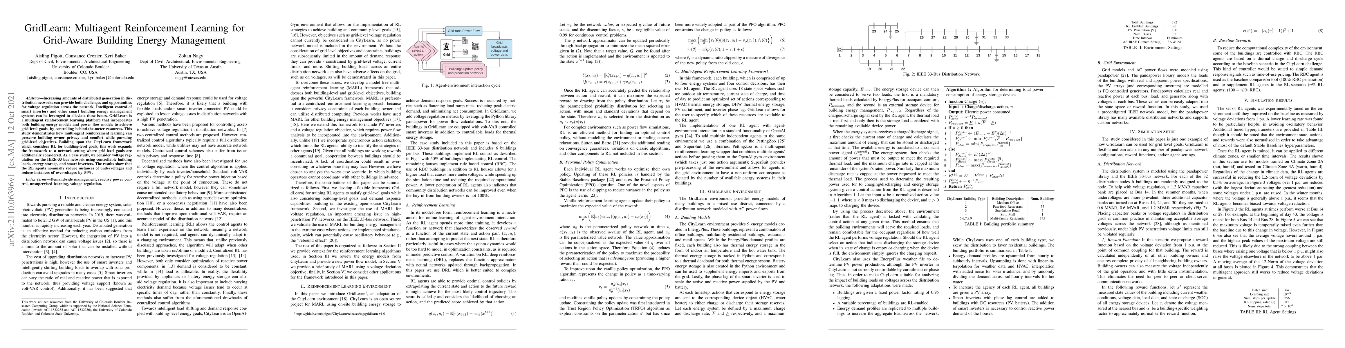 GridLearn employs multiagent reinforcement learning to manage grid-aware building energy systems, balancing building comfort and owner privacy while addressing voltage regulation challenges in distribution networks. The study shows a 34% reduction in undervoltages and overvoltages on the IEEE-33 bus network using controllable building resources.