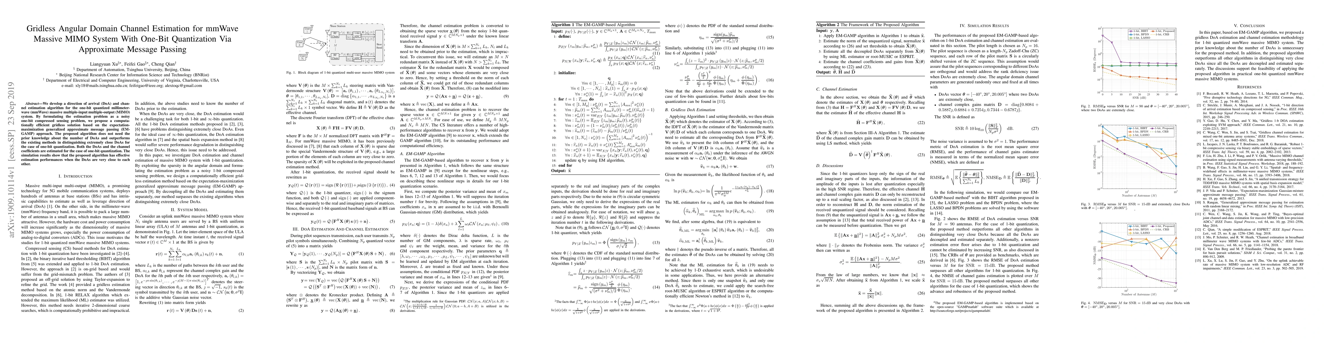 This paper proposes a gridless angular domain channel estimation algorithm for one-bit quantized mmWave massive MIMO systems using EMGAMP. The method efficiently estimates direction of arrival and channel coefficients without prior DoA knowledge, outperforming existing methods in scenarios with closely spaced DoAs.