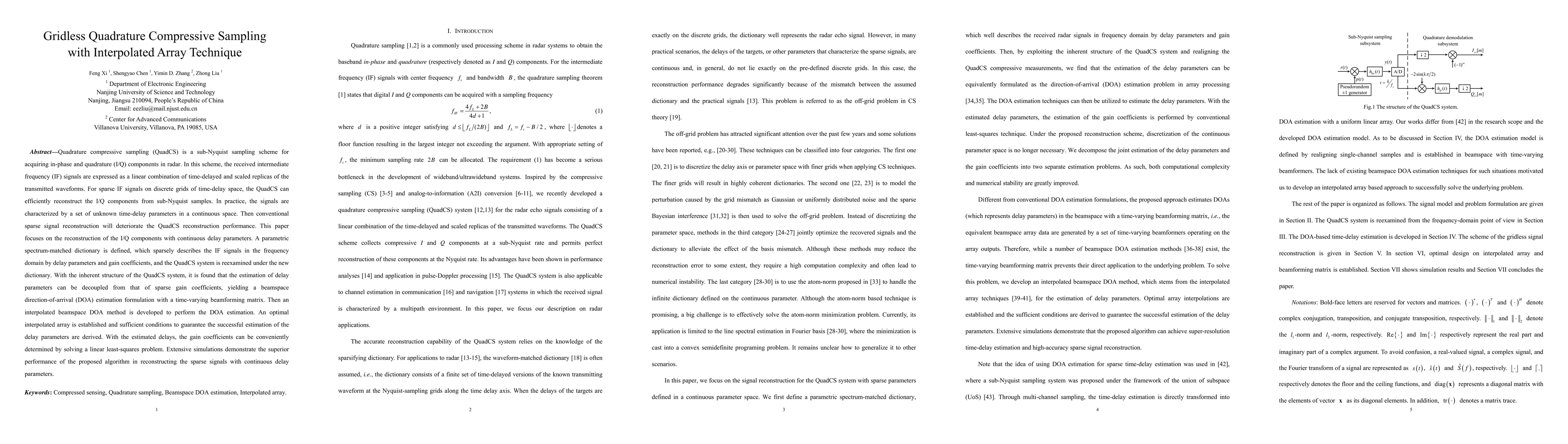 This paper proposes a gridless quadrature compressive sampling technique for reconstructing in-phase and quadrature components in radar systems. It introduces an interpolated array method for beamspace direction-of-arrival estimation, enabling successful reconstruction of sparse signals with continuous delay parameters.