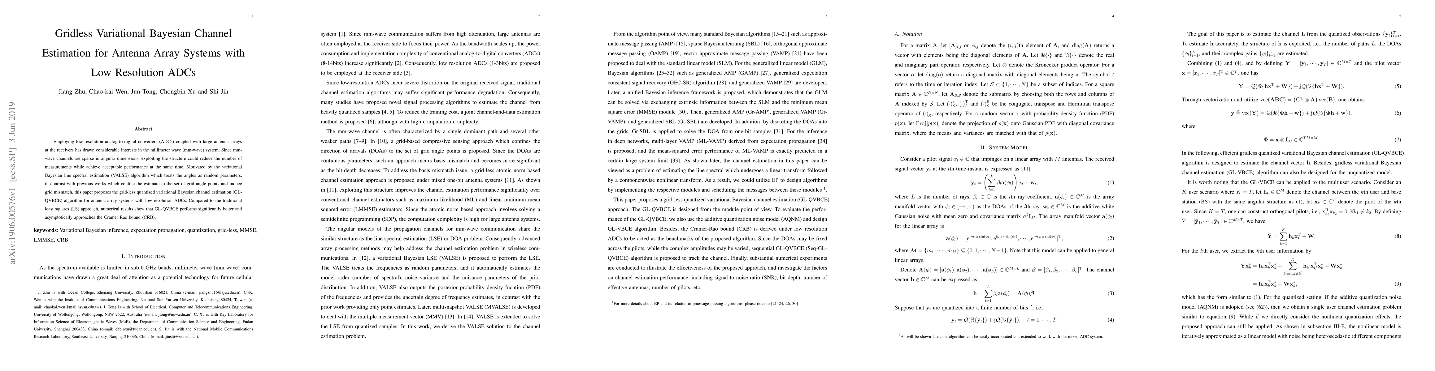 This paper proposes a gridless variational Bayesian channel estimation (GL-QVBCE) algorithm for antenna arrays using low-resolution ADCs in mm-wave systems. Unlike traditional methods, GL-QVBCE avoids grid mismatch by not confining angle estimates to predefined points, leading to better performance and asymptotic approach to the Cramér-Rao bound compared to least squares methods.