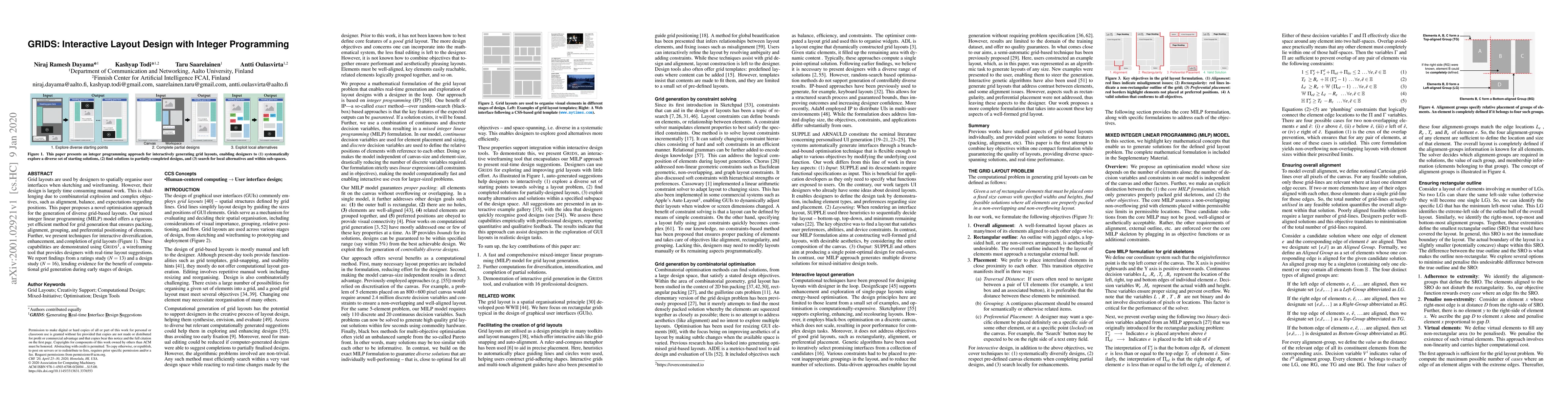 Grid layouts are used by designers to spatially organise user interfaces when sketching and wireframing. However, their design is largely time consuming manual work. This is challenging due to combinatorial explosion and complex objectives, such as alignment, balance, and expectations regarding positions. This paper proposes a novel optimisation approach for the generation of diverse grid-based layouts. Our mixed integer linear programming (MILP) model offers a rigorous yet efficient method for grid generation that ensures packing, alignment, grouping, and preferential positioning of elements. Further, we present techniques for interactive diversification, enhancement, and completion of grid layouts (Figure 1). These capabilities are demonstrated using GRIDS1, a wireframing tool that provides designers with real-time layout suggestions. We report findings from a ratings study (N = 13) and a design study (N = 16), lending evidence for the benefit of computational grid generation during early stages of design.