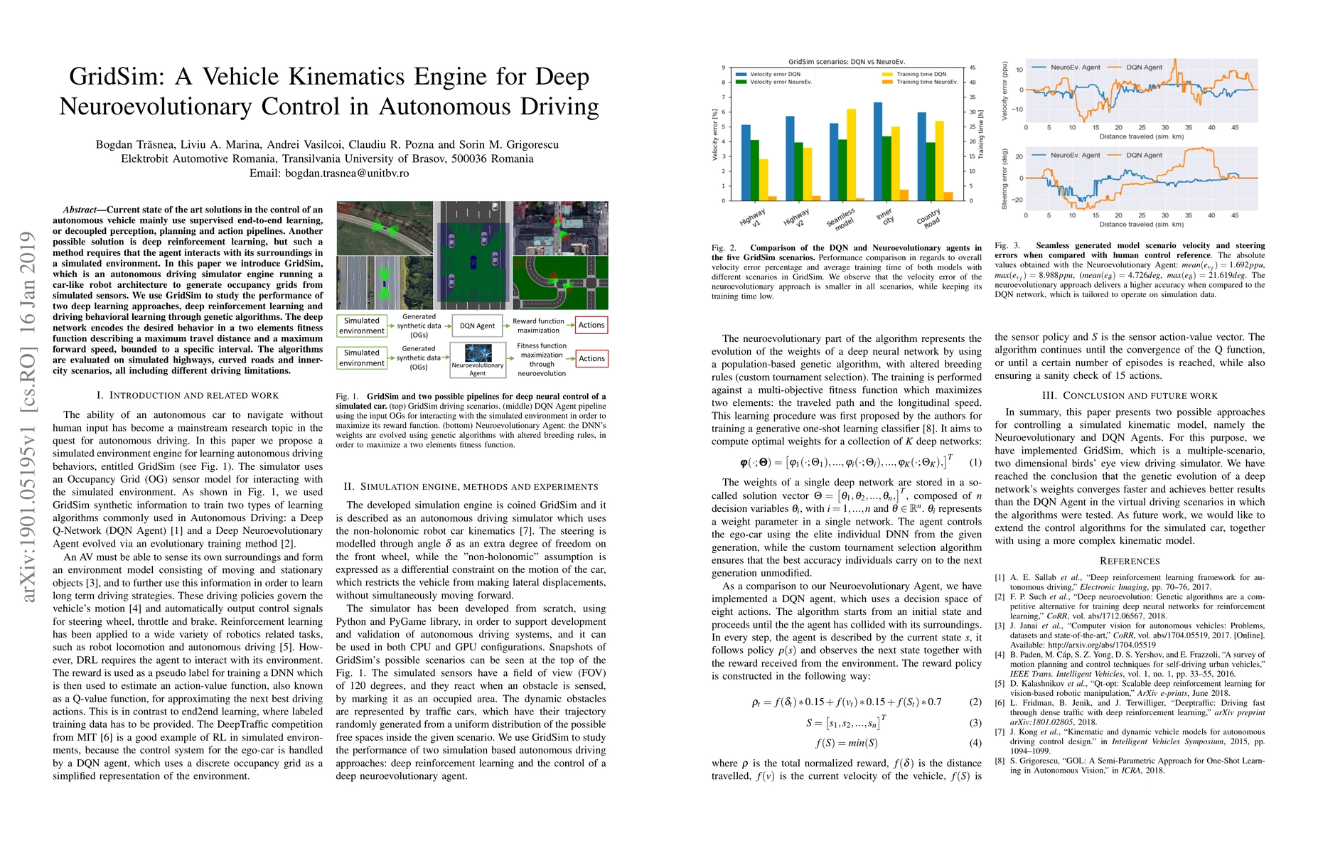 Current state of the art solutions in the control of an autonomous vehicle mainly use supervised end-to-end learning, or decoupled perception, planning and action pipelines. Another possible solution is deep reinforcement learning, but such a method requires that the agent interacts with its surroundings in a simulated environment. In this paper we introduce GridSim, which is an autonomous driving simulator engine running a car-like robot architecture to generate occupancy grids from simulated sensors. We use GridSim to study the performance of two deep learning approaches, deep reinforcement learning and driving behavioral learning through genetic algorithms. The deep network encodes the desired behavior in a two elements fitness function describing a maximum travel distance and a maximum forward speed, bounded to a specific interval. The algorithms are evaluated on simulated highways, curved roads and inner-city scenarios, all including different driving limitations.