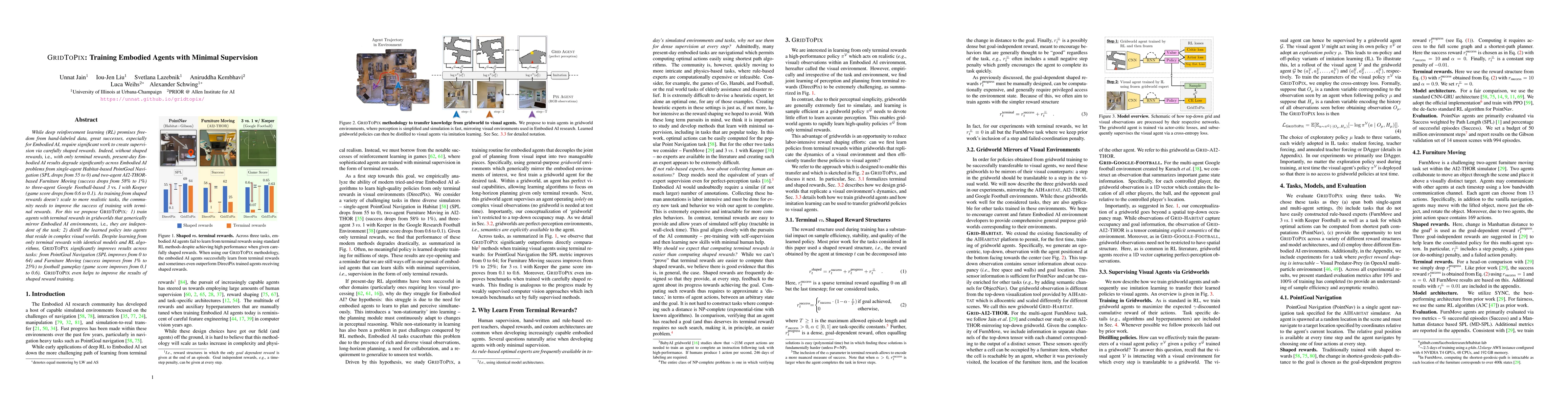 While deep reinforcement learning (RL) promises freedom from hand-labeled data, great successes, especially for Embodied AI, require significant work to create supervision via carefully shaped rewards. Indeed, without shaped rewards, i.e., with only terminal rewards, present-day Embodied AI results degrade significantly across Embodied AI problems from single-agent Habitat-based PointGoal Navigation (SPL drops from 55 to 0) and two-agent AI2-THOR-based Furniture Moving (success drops from 58% to 1%) to three-agent Google Football-based 3 vs. 1 with Keeper (game score drops from 0.6 to 0.1). As training from shaped rewards doesn't scale to more realistic tasks, the community needs to improve the success of training with terminal rewards. For this we propose GridToPix: 1) train agents with terminal rewards in gridworlds that generically mirror Embodied AI environments, i.e., they are independent of the task; 2) distill the learned policy into agents that reside in complex visual worlds. Despite learning from only terminal rewards with identical models and RL algorithms, GridToPix significantly improves results across tasks: from PointGoal Navigation (SPL improves from 0 to 64) and Furniture Moving (success improves from 1% to 25%) to football gameplay (game score improves from 0.1 to 0.6). GridToPix even helps to improve the results of shaped reward training.